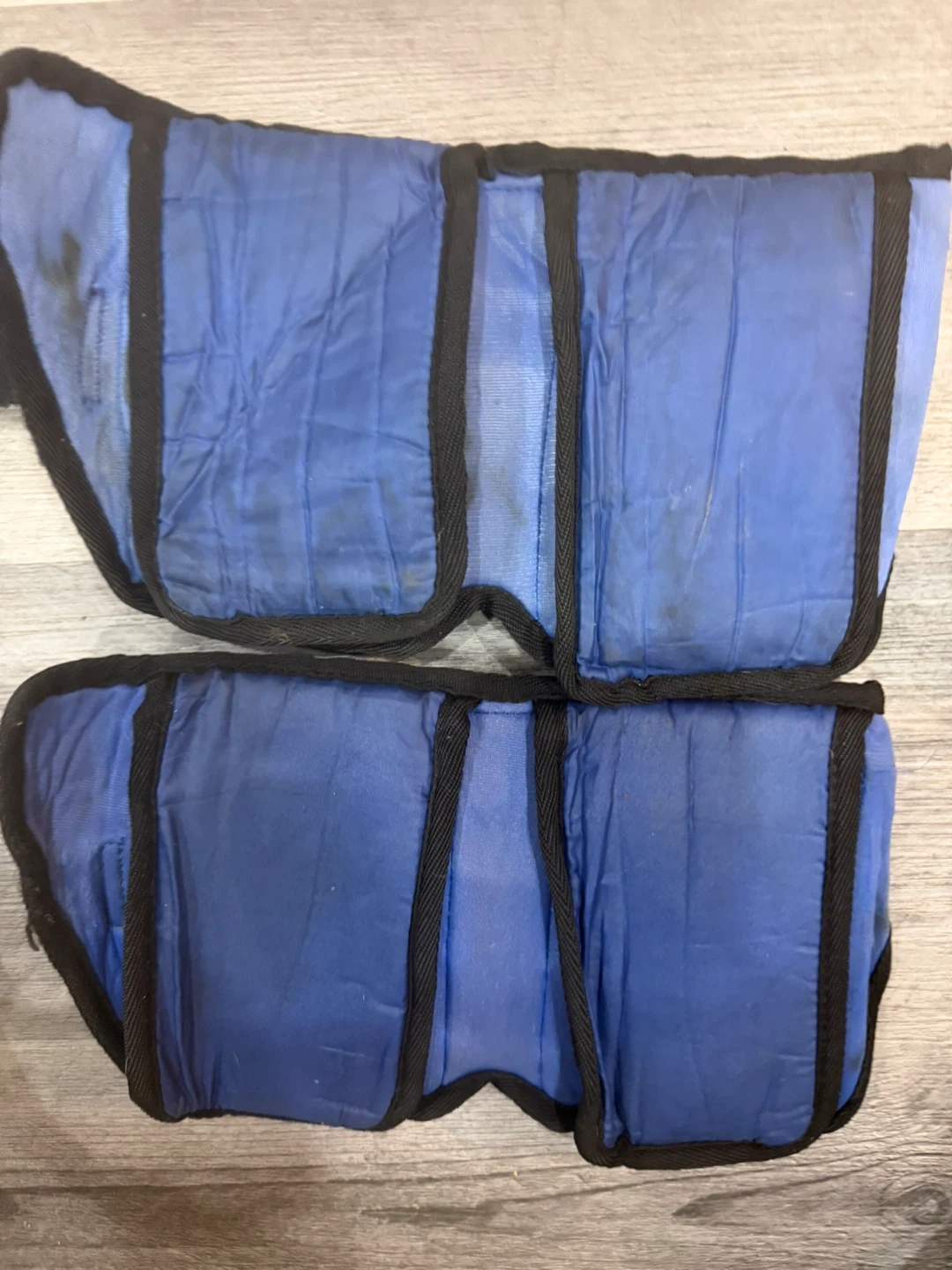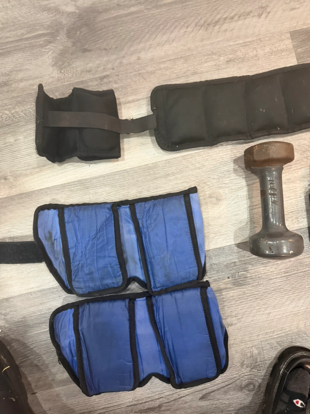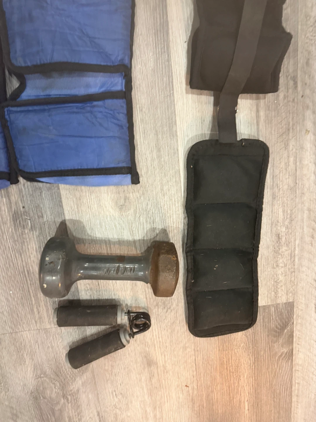 Includes a pair of blue weighted ankle/wrist weights and a single dumbbell. Weights are adjustable and have velcro straps. Great for adding resistance to workouts!