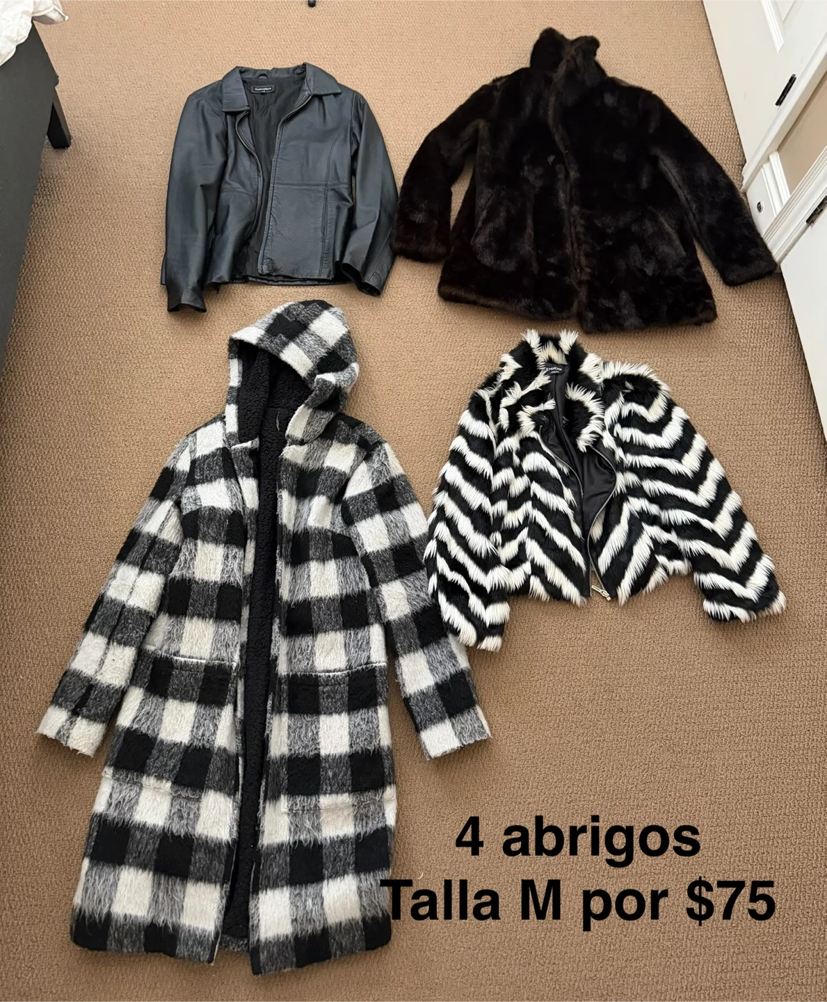 Bundle of four women's jackets, all in size medium. Includes a faux leather jacket, a dark faux fur jacket, a plaid sherpa-lined hooded coat, and a black and white chevron faux fur jacket. Great for staying stylish and warm!