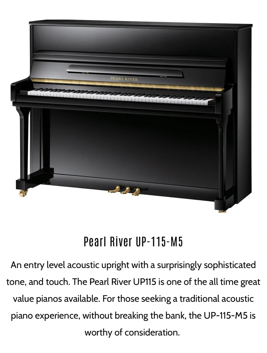 Pearl River UP-115-M5 acoustic upright piano. It has a sophisticated tone and touch. This piano is great value for those wanting a traditional acoustic piano experience.