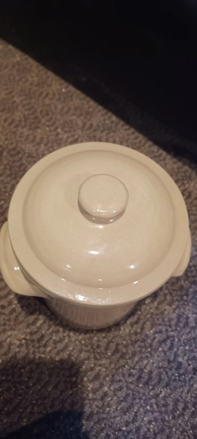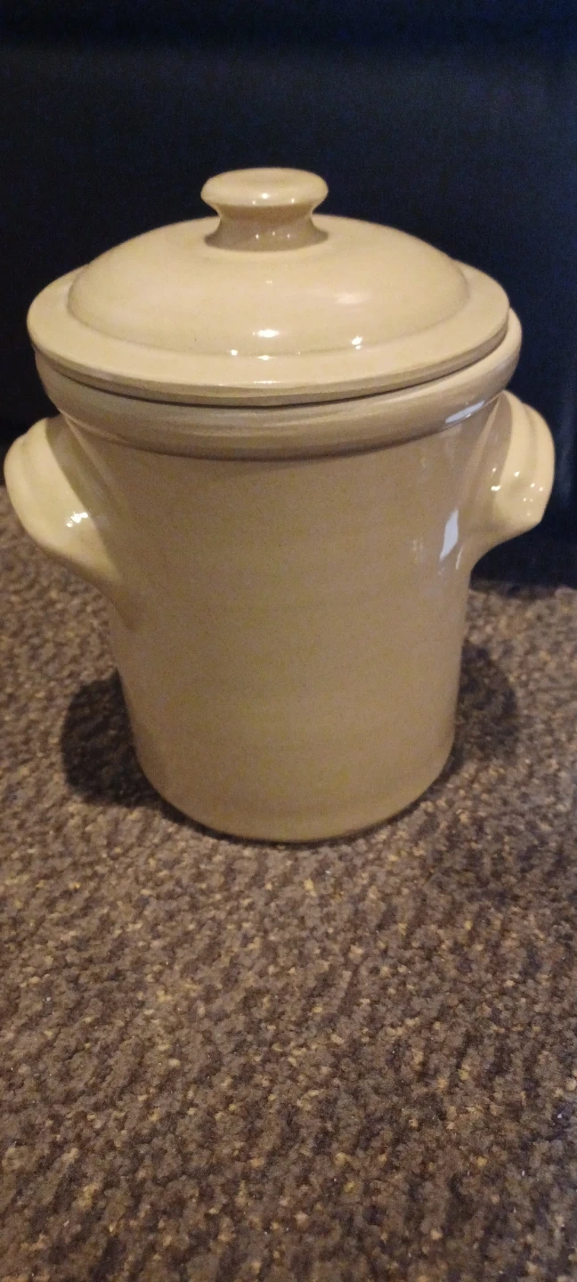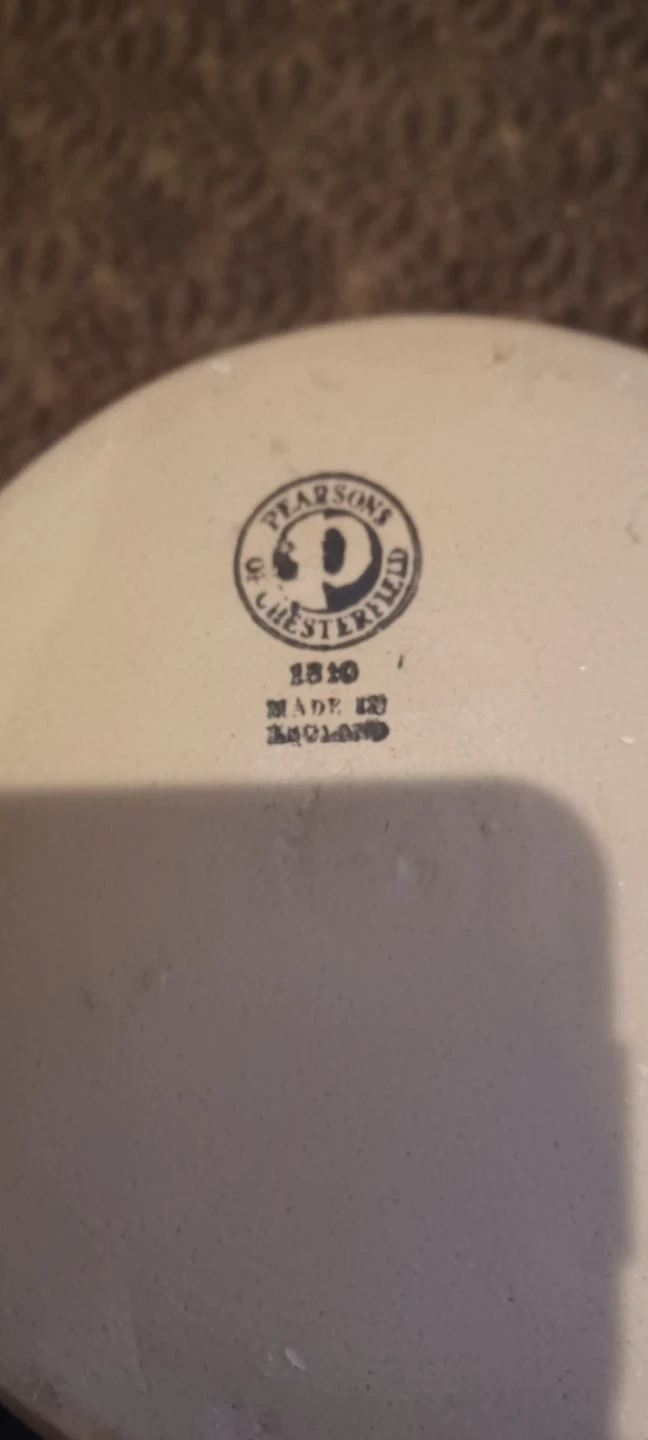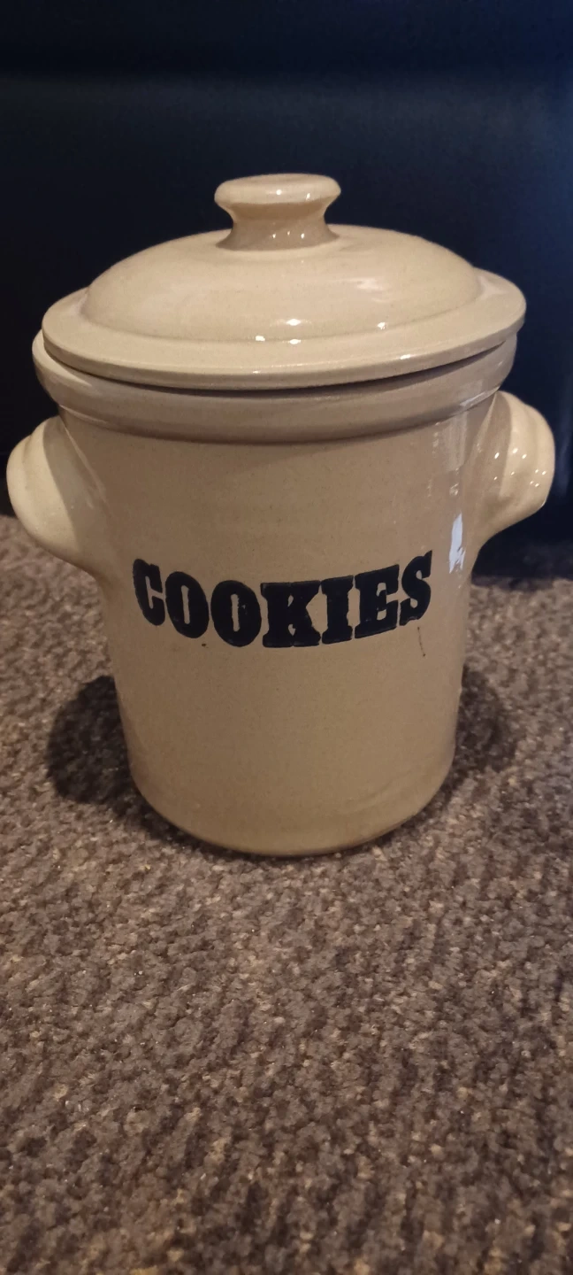 This is a used Pearson's of Chesterfield stoneware cookie jar with lid. It is beige with black lettering. This cookie jar measures approximately 7" tall and 6" wide. I've always found it to be a delightful addition to my kitchen, holding treats and memories alike! I hope it finds a good home where it will be appreciated and well-used.