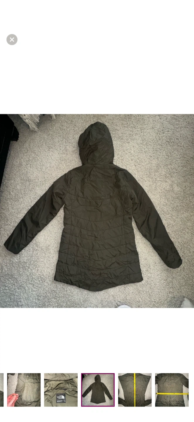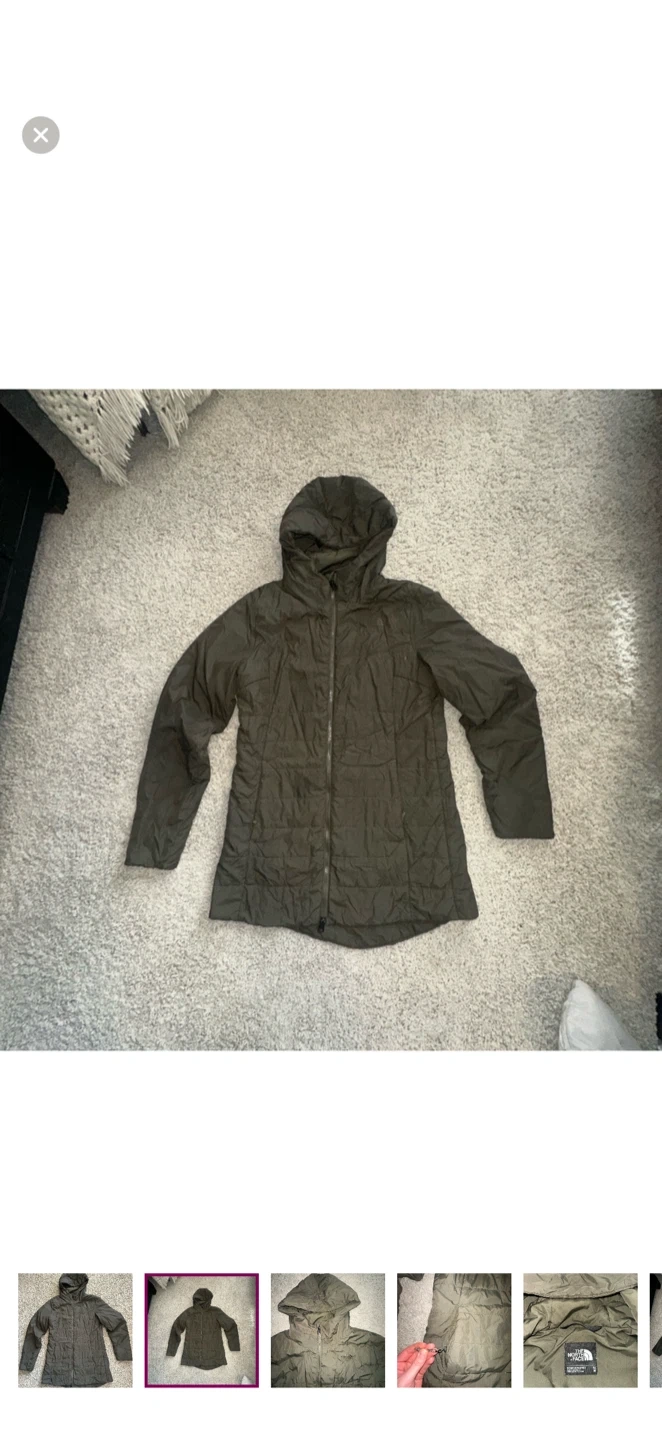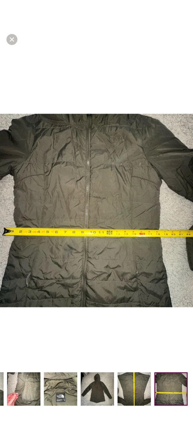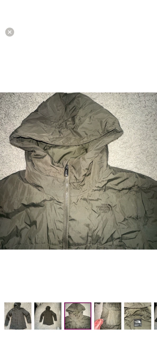 The North Face insulated jacket in olive green. Features a full zip front and attached hood. This jacket is great for staying warm in cooler weather!