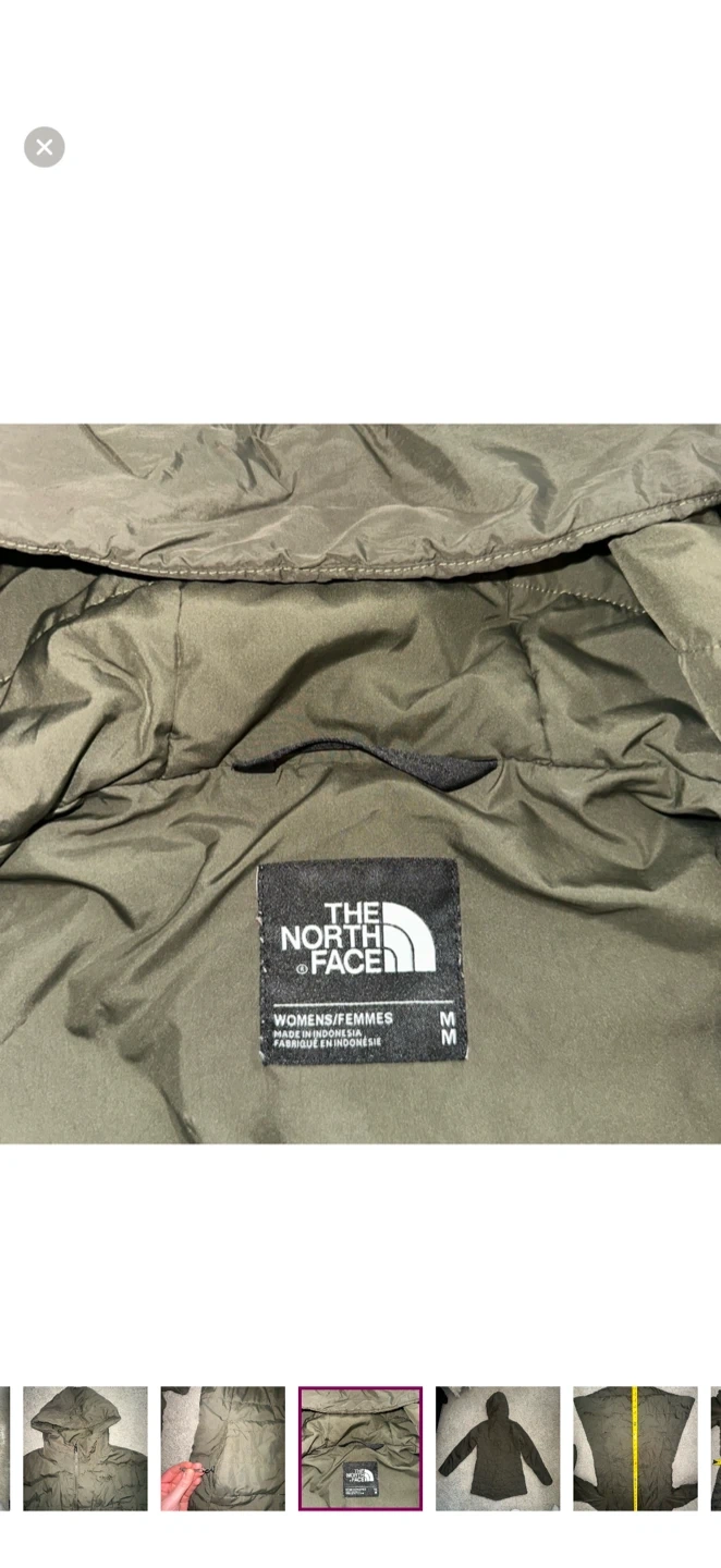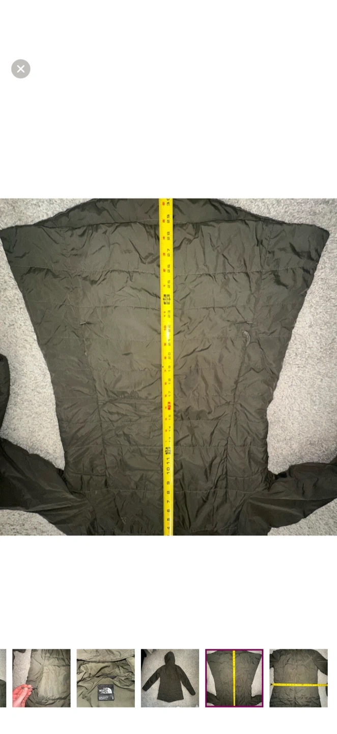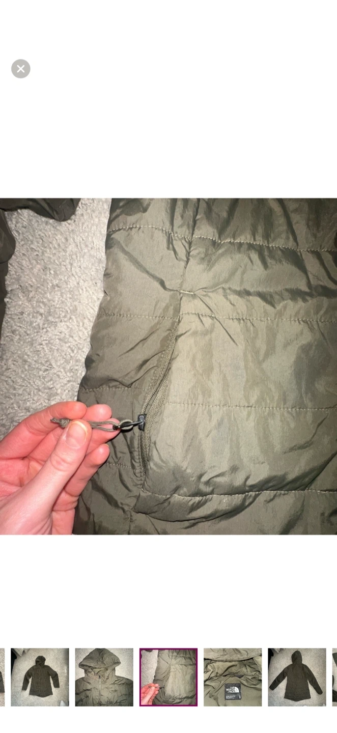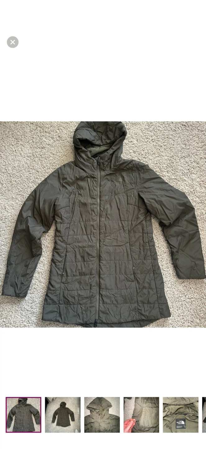 The North Face insulated jacket in olive green. Features a full zip front and attached hood. This jacket is great for staying warm in cooler weather!