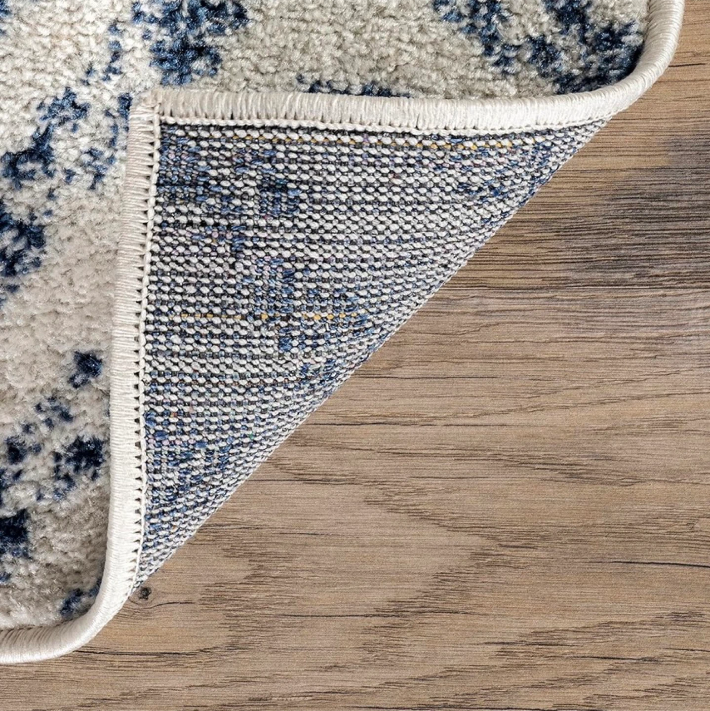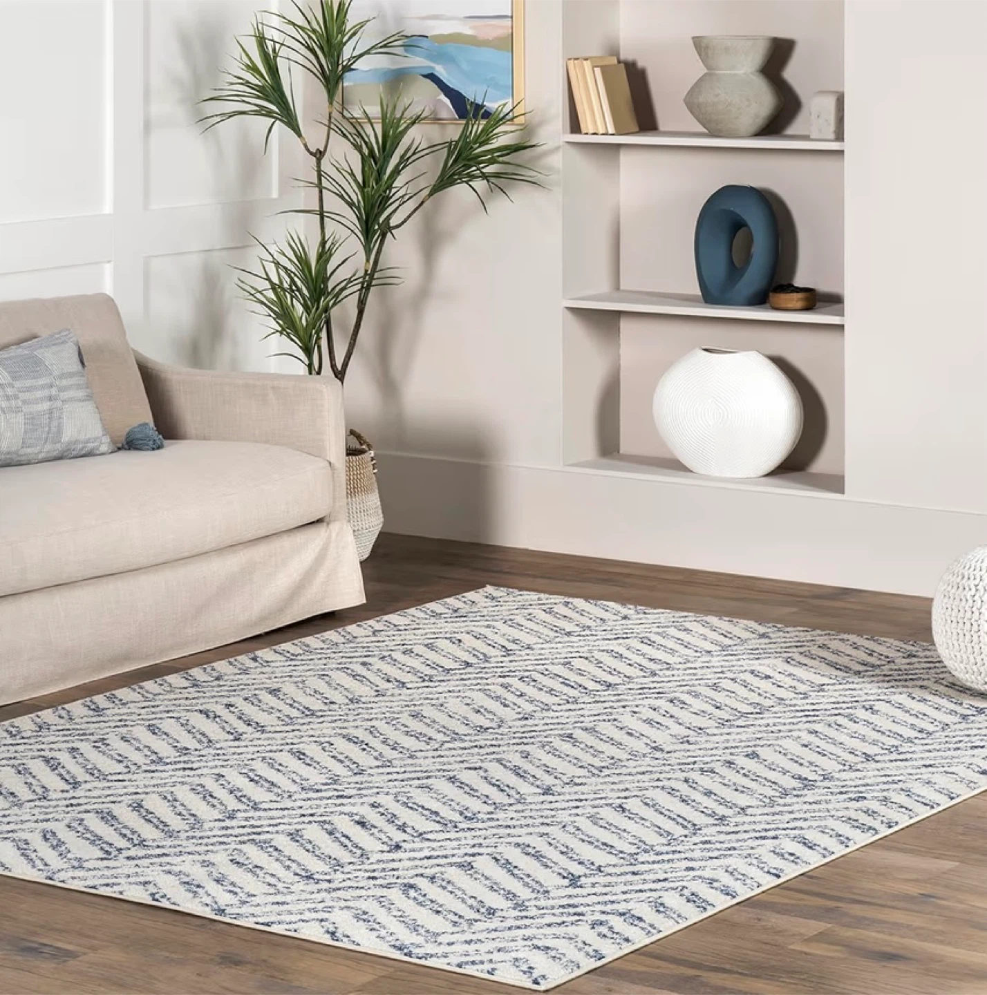 This area rug features a blue and white geometric pattern. It has a soft, comfy surface with a .31" pile height. Kid and pet-friendly and vacuum safe for easy care!
