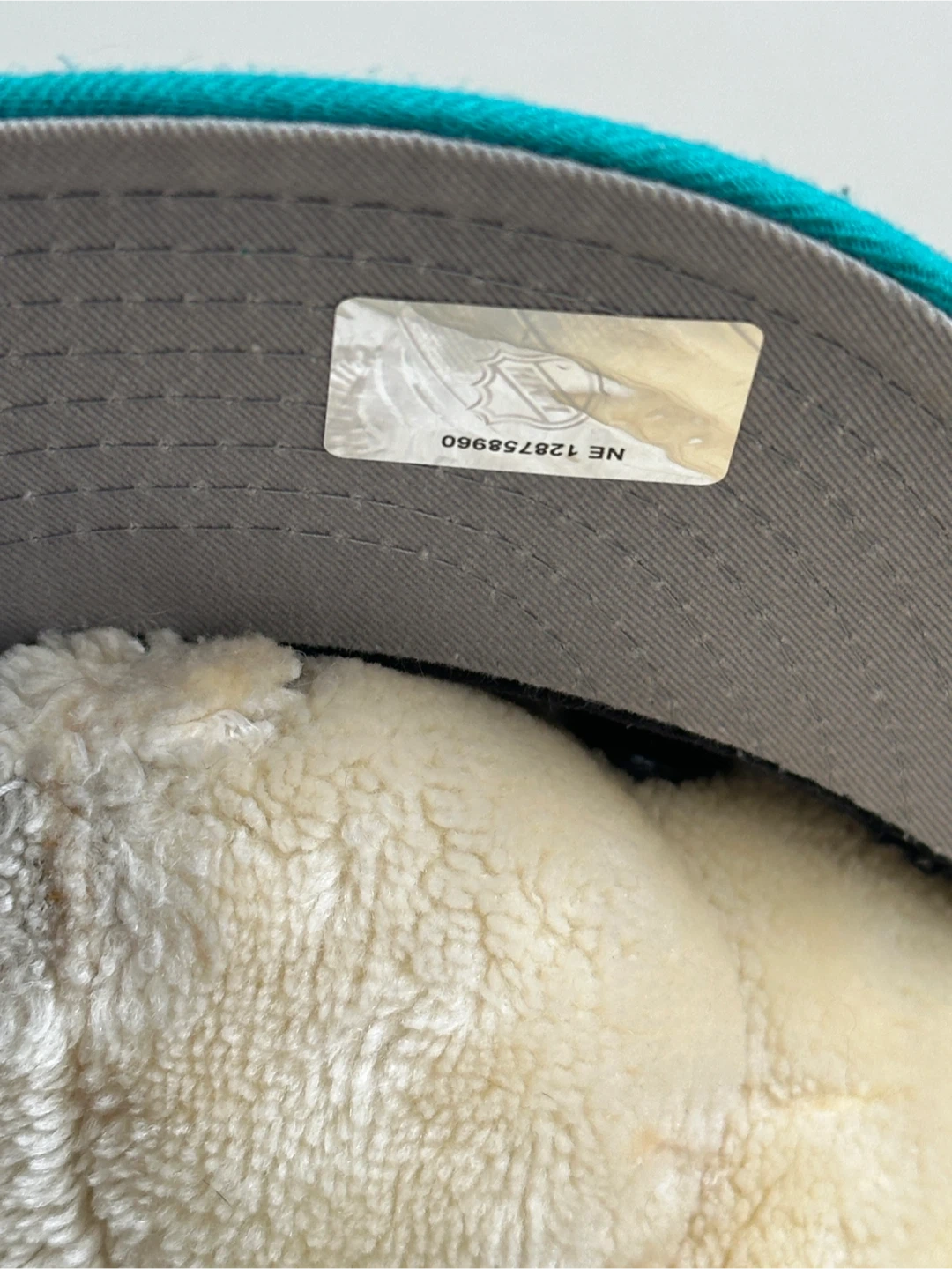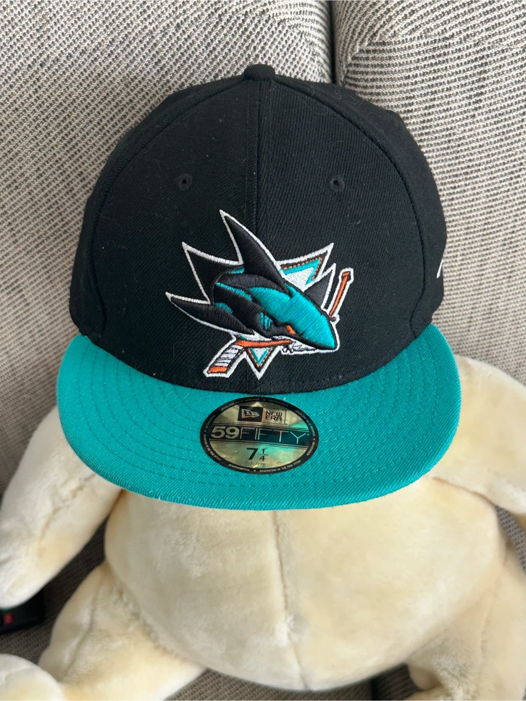 A black and teal New Era 59FIFTY fitted baseball cap featuring the San Jose Sharks logo. It's a size 7 1/4.