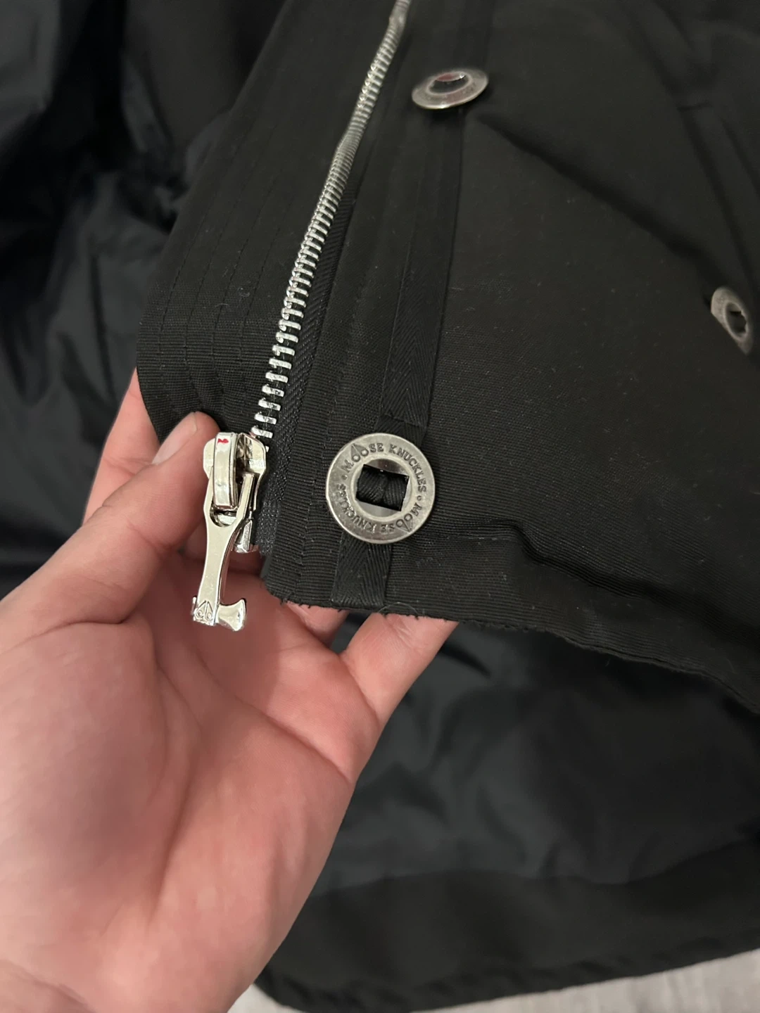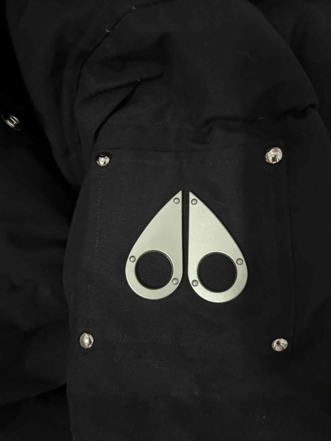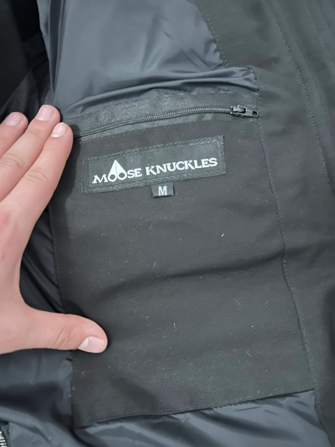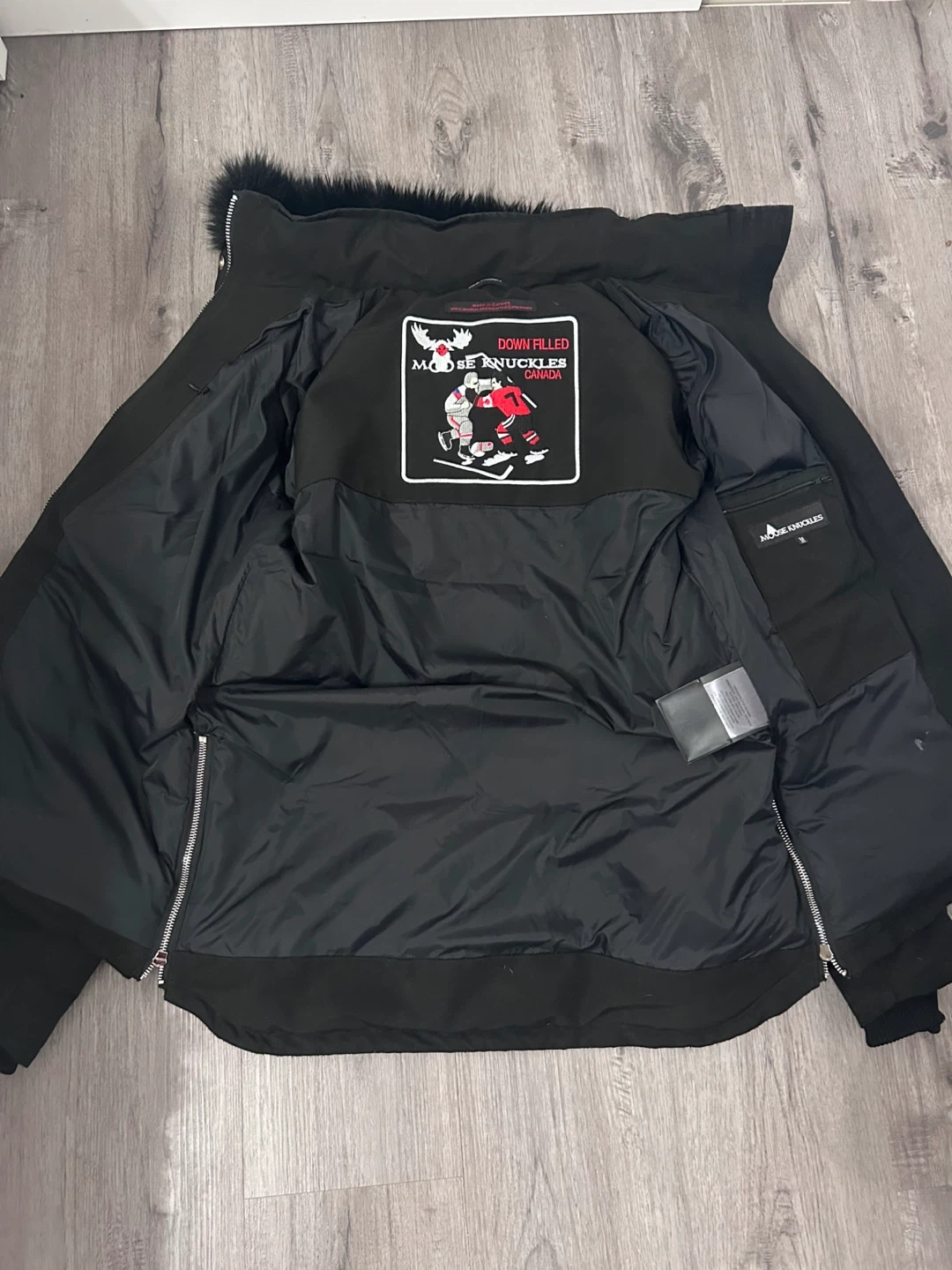 This is a Moose Knuckles down-filled jacket made in Canada. It's black and features a size medium tag inside. Perfect for staying warm during colder months! Comes with moose knuckles bag