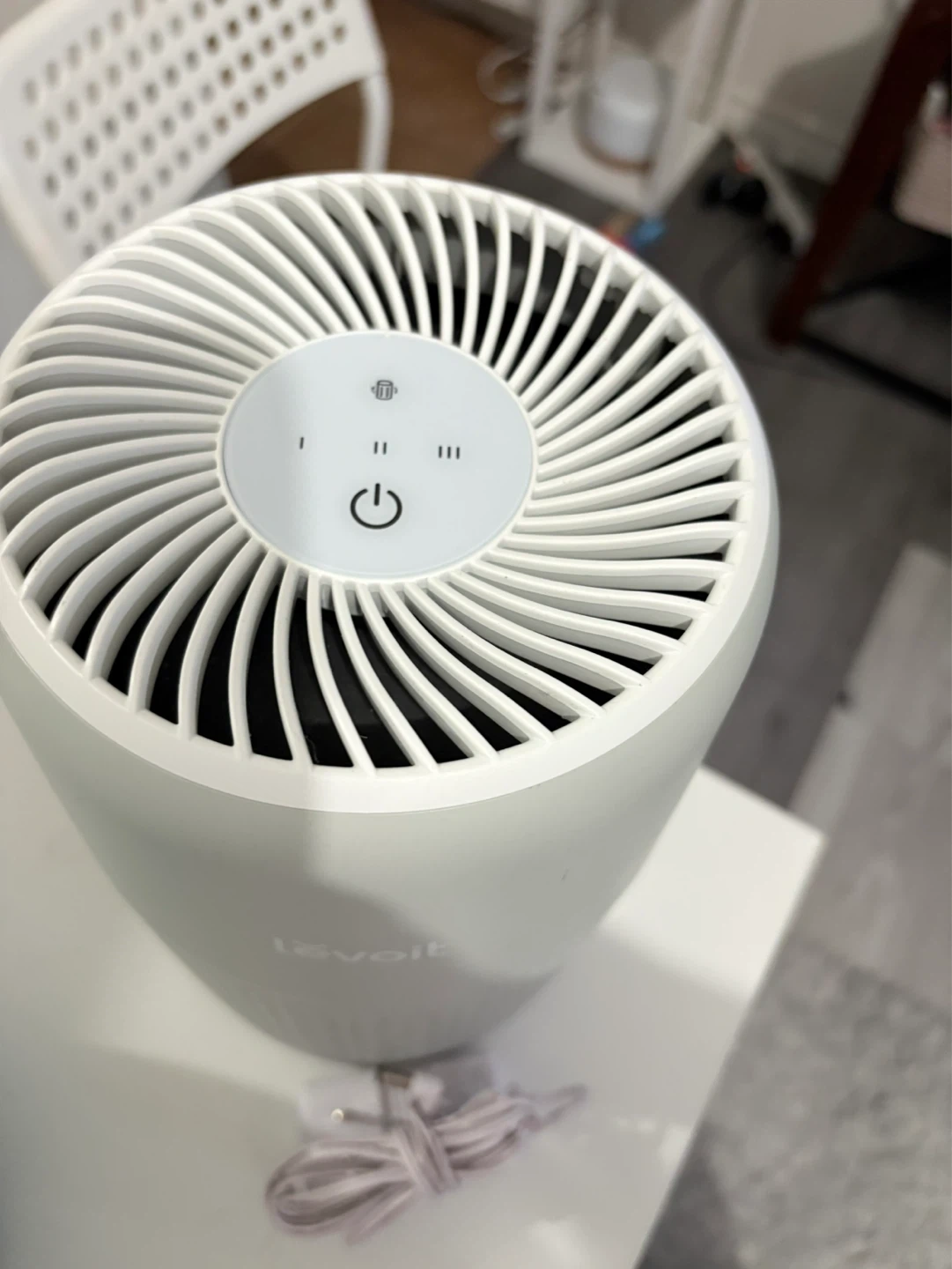 This Levoit air purifier is a compact unit designed for smaller spaces. It features a 3-stage filtration system including a HEPA filter. Includes power adapter. Rated Power: 7W.