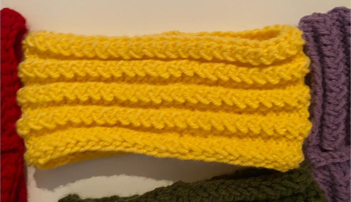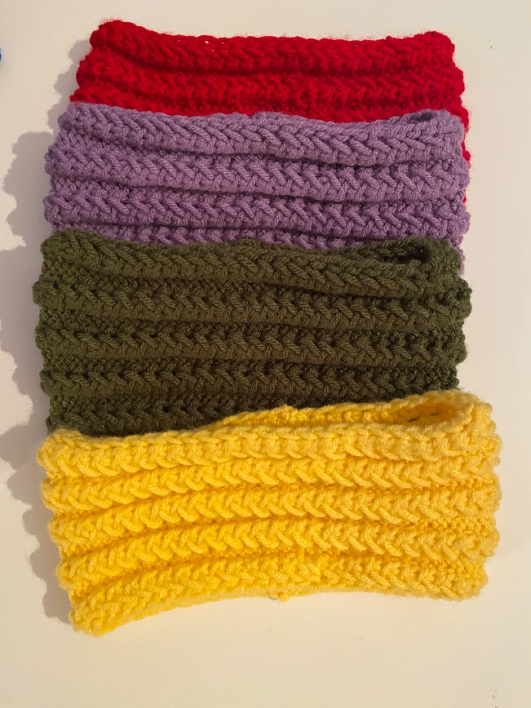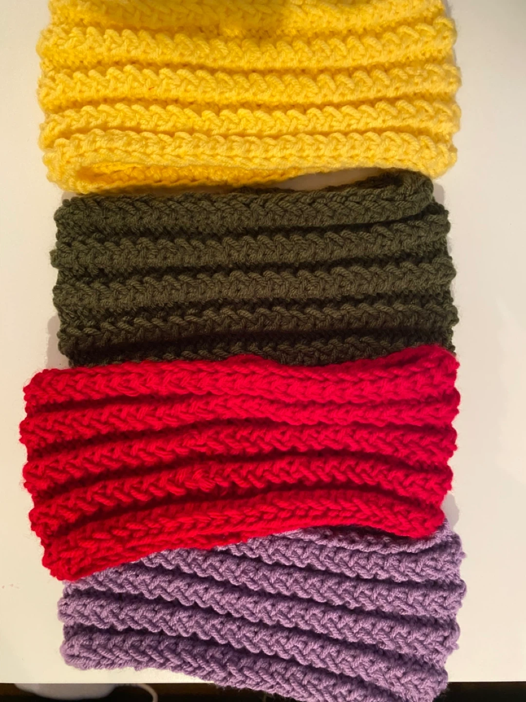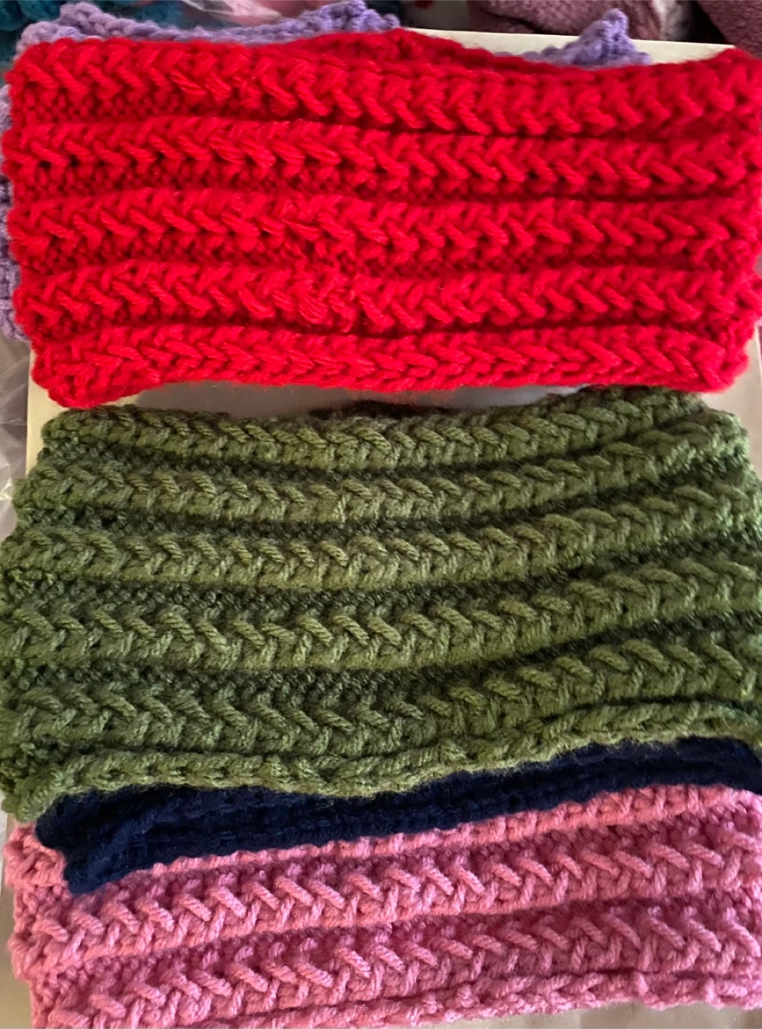 hand-knit headbands. Includes colours in red, navy, olive green, purple, and pink. They're made from a soft acrylic yarn. These are great for keeping hair back and ears warm!