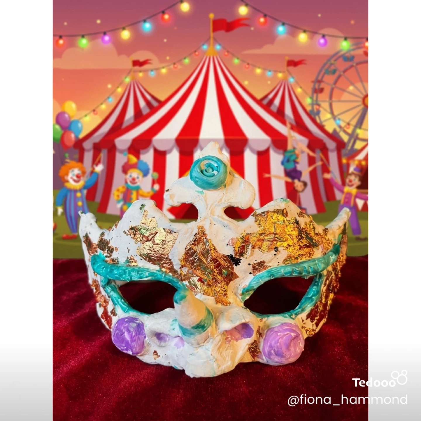 This is a unique, handmade decorative mask. It features a white base with gold leaf accents and teal and purple detailing. It's designed to be a statement piece for costumes or display. One of a kind!