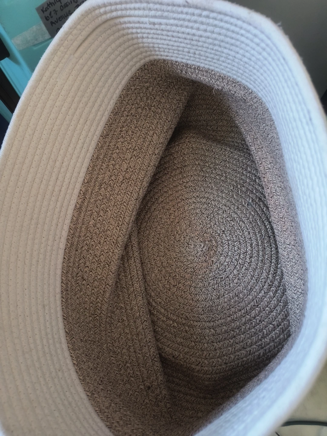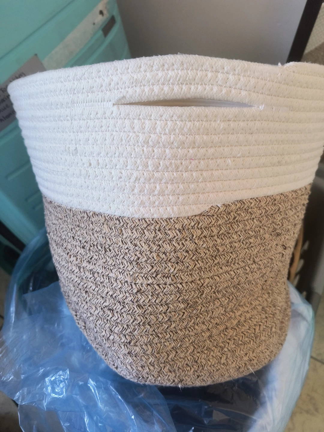 This woven rope storage basket is great for organizing your home or just be a laundry baketm It's made of a durable cotton and jute blend. It's in good shape just a scruff on the side that could be washed. If I had a laundry machine in my house id put it through the washer