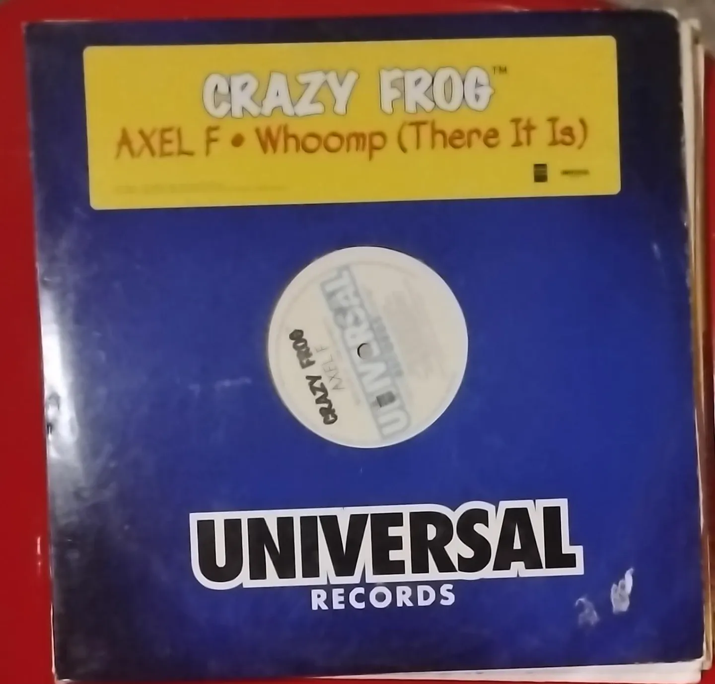 This is the Crazy Frog single featuring 'Axel F' and 'Whoomp (There It Is)'. It's a 12-inch vinyl record. The record is housed in a Universal Records sleeve.