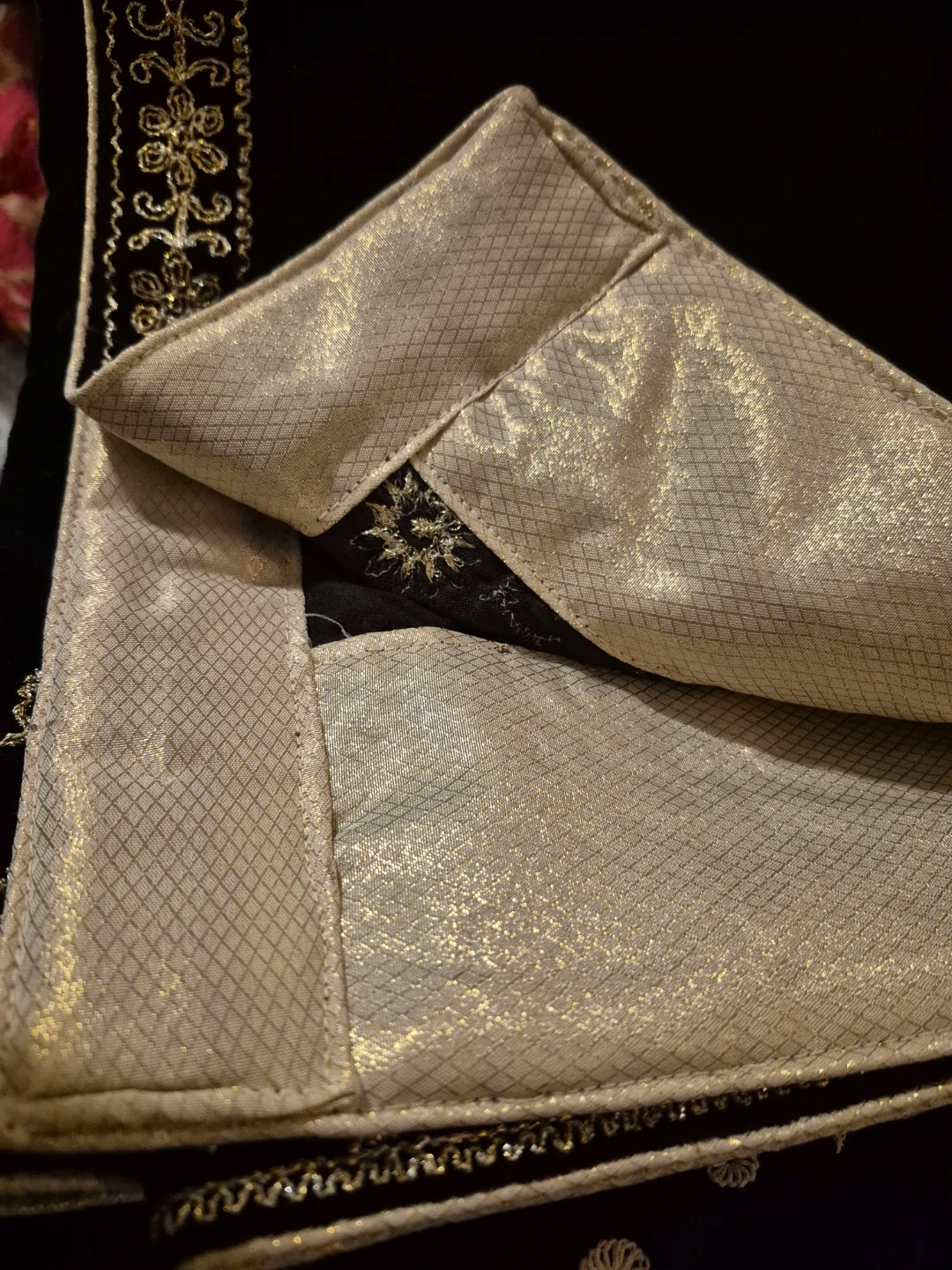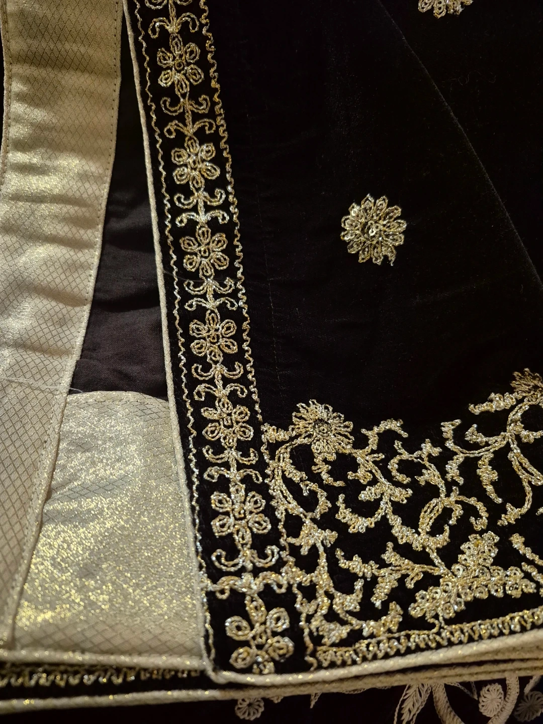Beautiful dark brown velvet shawal with gold embroidery. Adds a touch of elegance for events , from my preloved collection