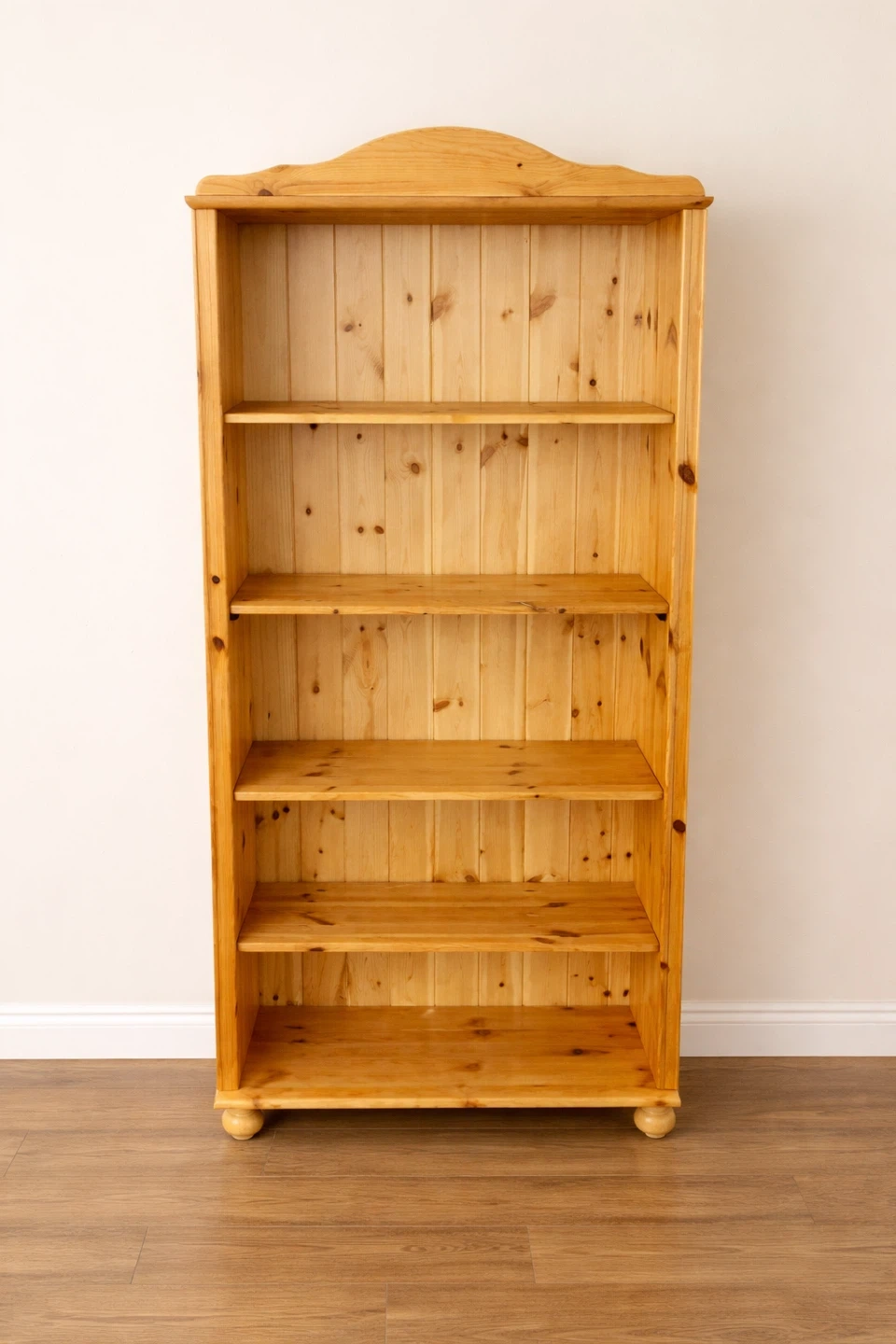 This is a pine wood bookshelf with five shelves. It's a light wood colour with a natural finish. This piece is great for organizing books or displaying decor. 2 available.