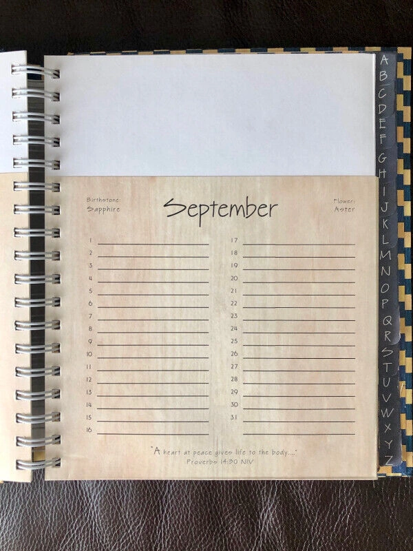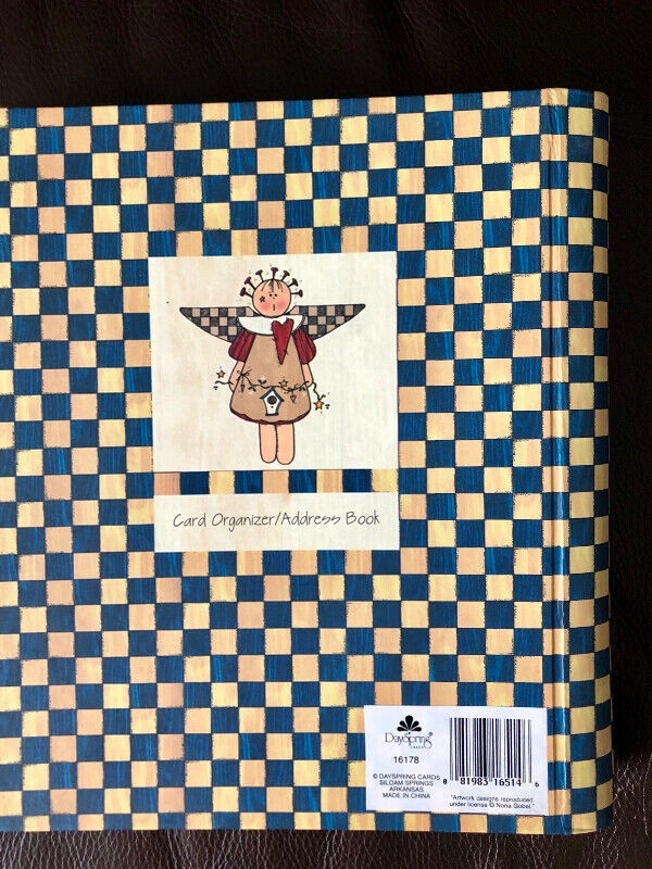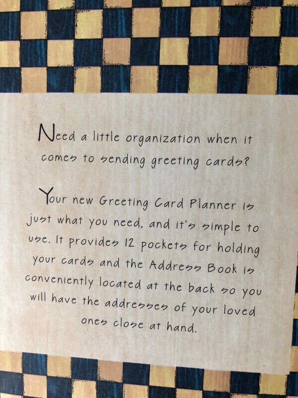 Never used. Stay organized with all those cards you purchase for your family and friends. This book is a great place to keep them until you need them - you won’t be searching for them anymore. Birthday, anniversary, sympathy, get well.... You can record names and dates by month. A convenient address book is at the back of the book. Brampton, near Queen and Kennedy.
