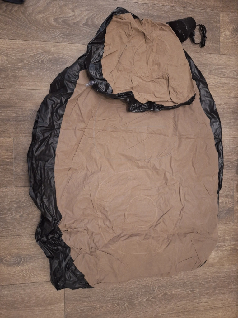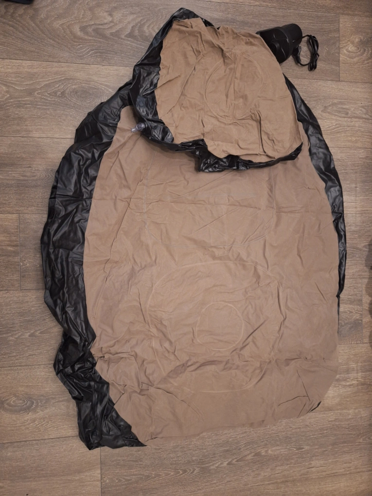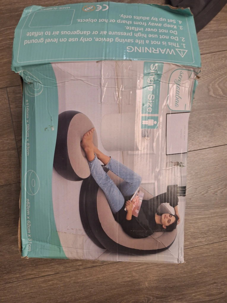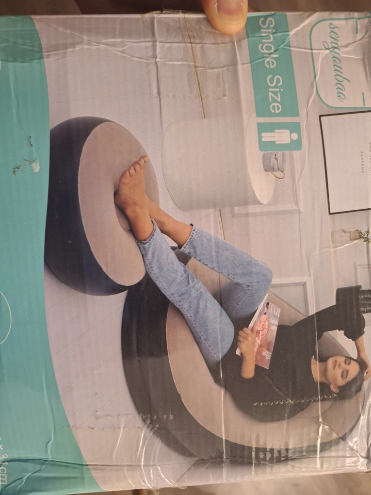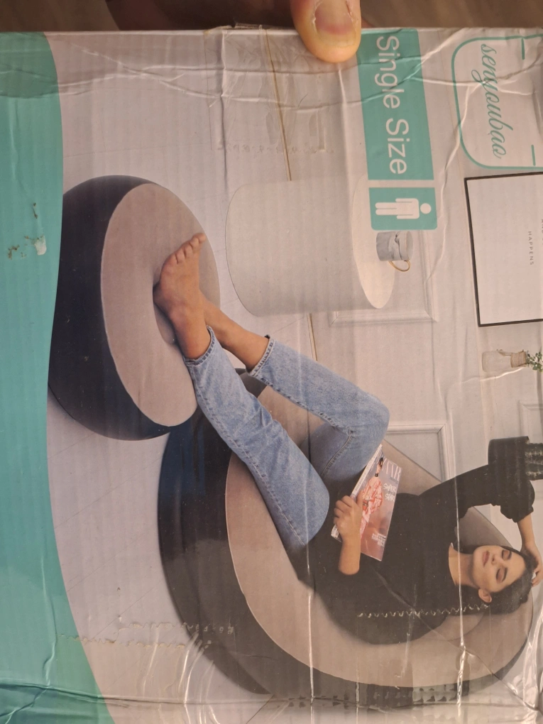 This is a single size inflatable chair. It's made of durable material and comes with a pump. Use it for lounging or extra seating anywhere!