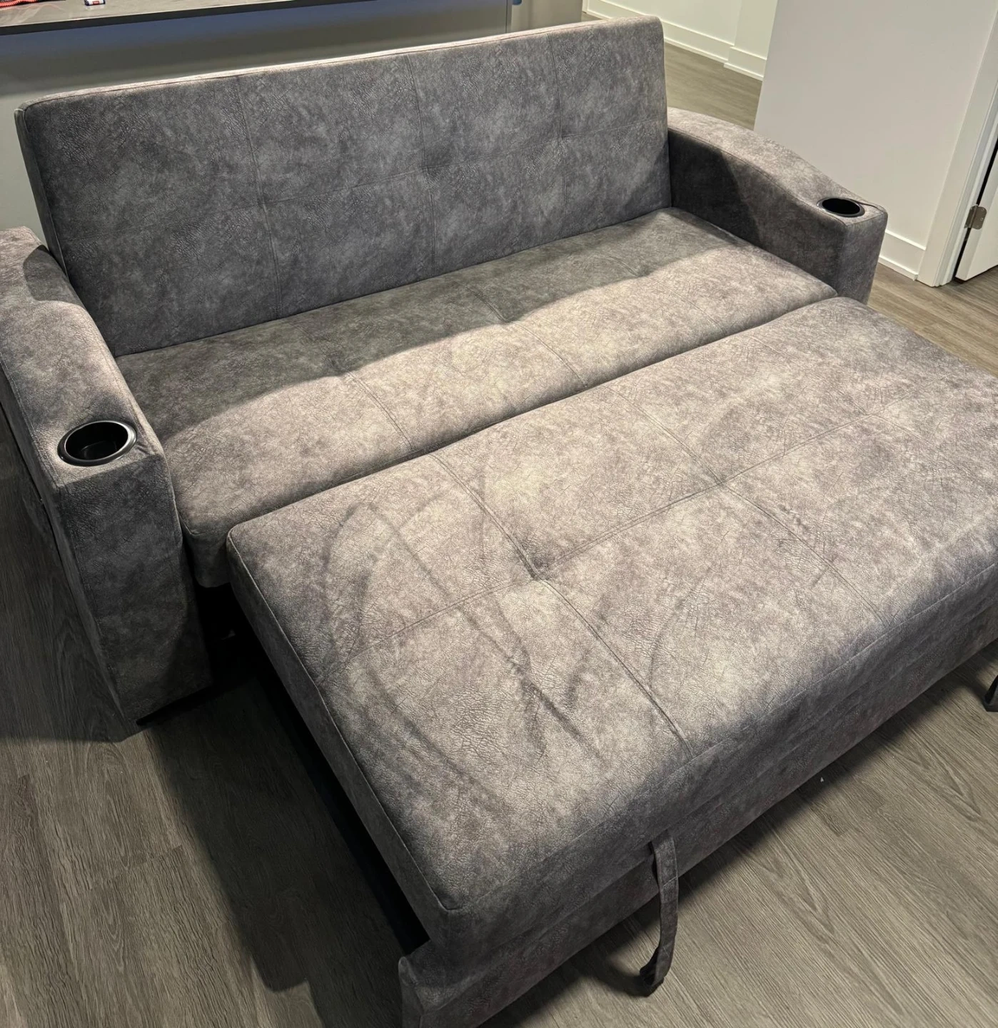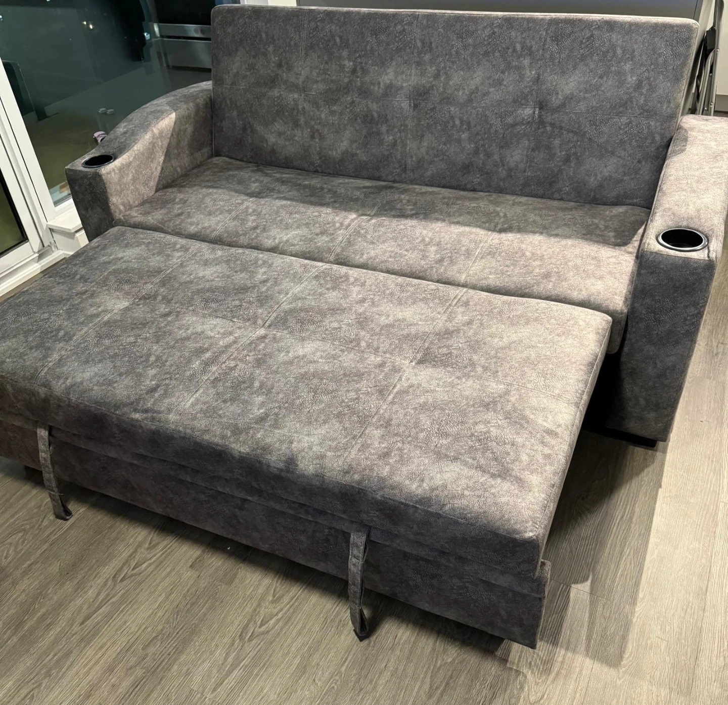 This versatile sofa bed easily converts for lounging or sleeping. It's upholstered in a soft, textured grey fabric and features built-in cup holders on the armrests.