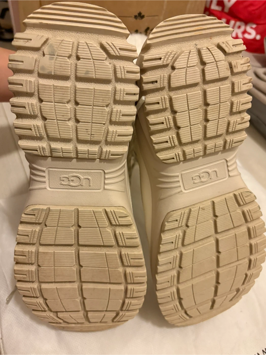 Selling a pair of UGG winter boots in a size 7.5! They're a stylish white leather with a cozy fur trim. Perfect for keeping your feet warm and dry during those chilly Canadian winters