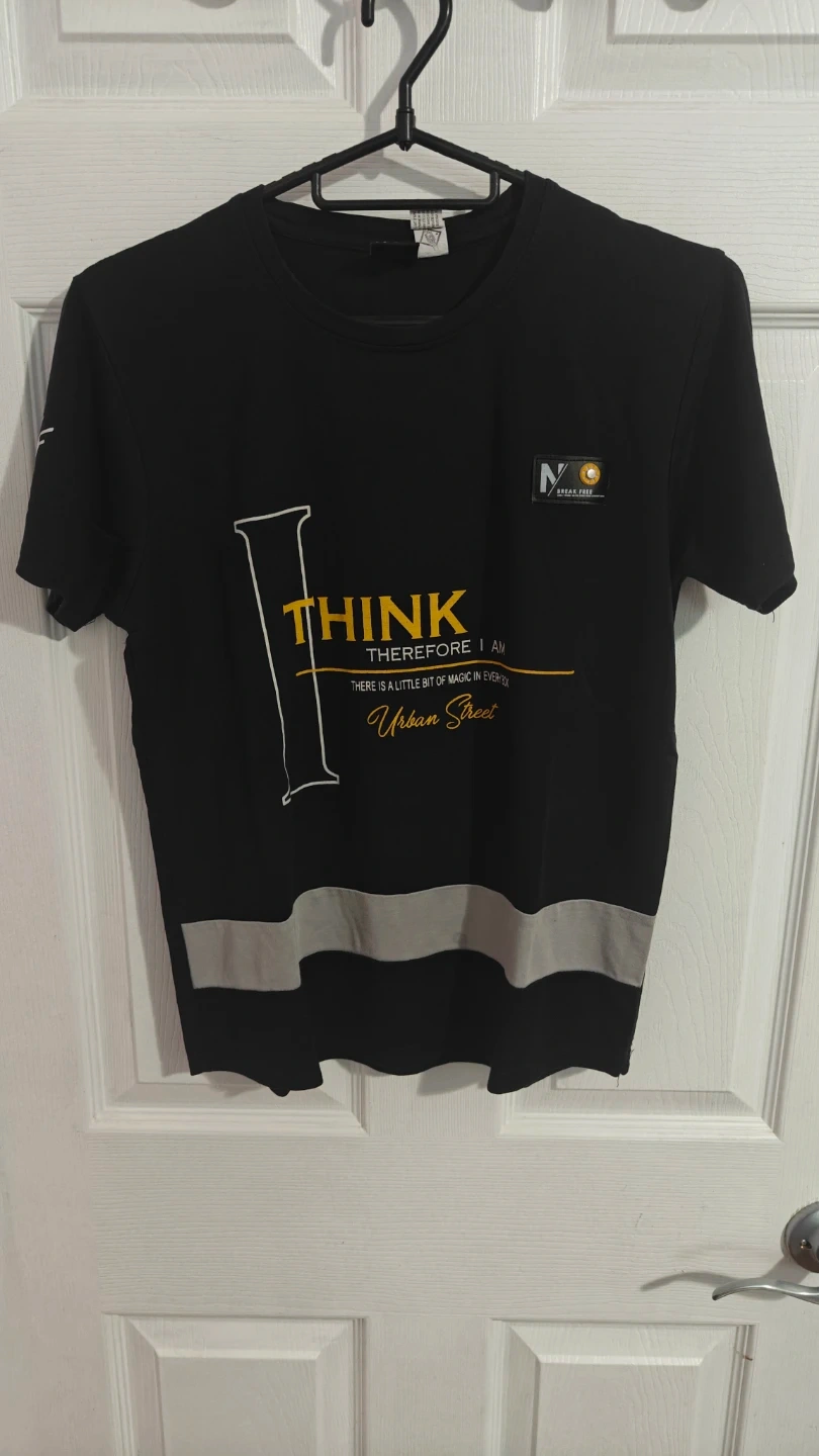 This is a brown short-sleeved t-shirt with a large "J7 DENIM" graphic on the front. It features a "FASHION IF STEALTH AROUND IF IS NOT GET DEMAD GO FOR IT" text detail. The material is cotton.