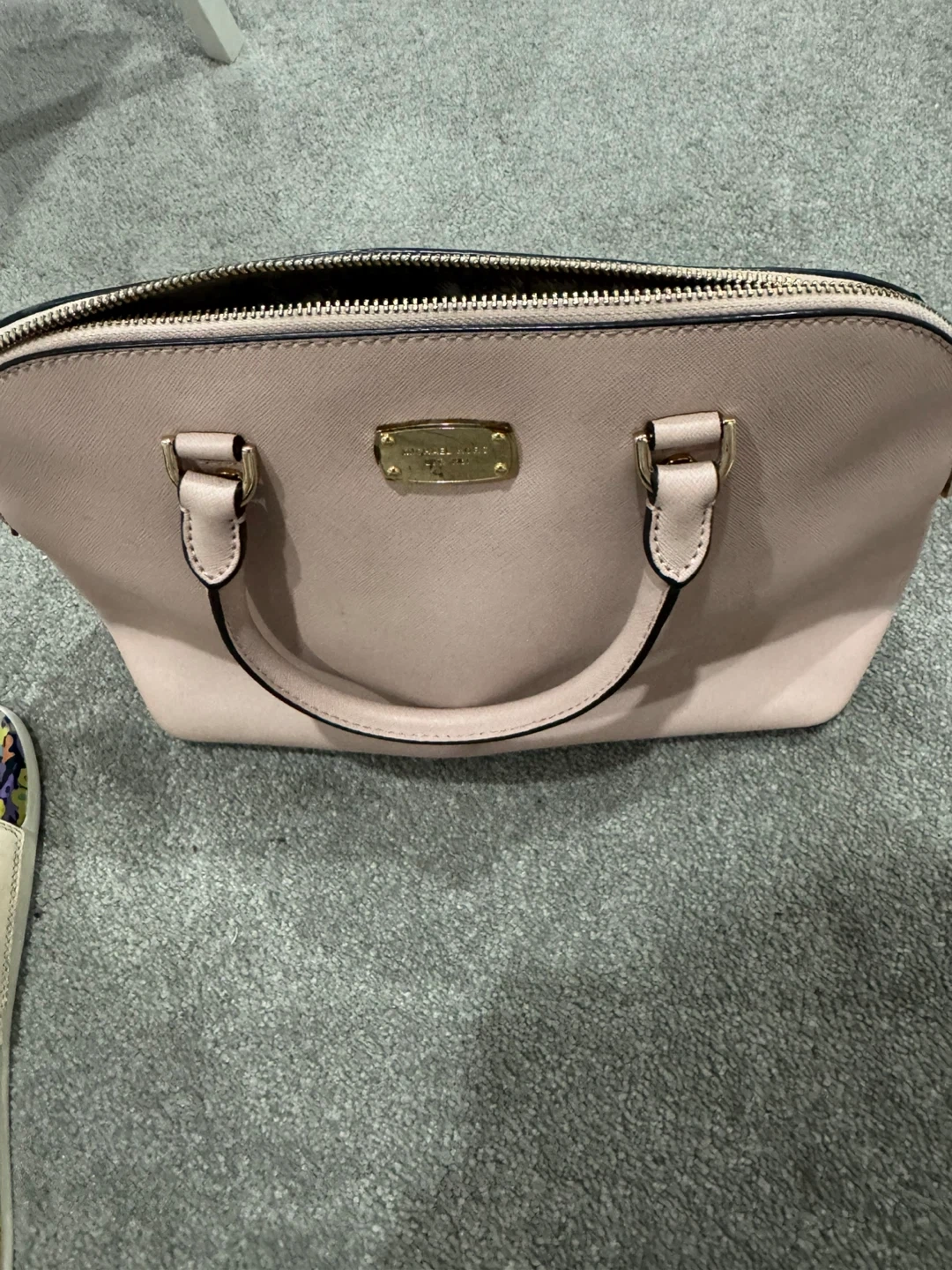 Michael Kors satchel handbag in a light pink colour. It has a zip closure and multiple interior pockets. Gold-tone hardware is present.