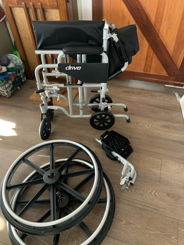 Selling a barely used Drive Medical 2-in-1 wheelchair in excellent, like-new condition. It easily converts from a standard wheelchair to a transport chair by detaching the large rear wheels for a lightweight, caregiver-push setup. Features smooth-rolling, durable wheels, a folding frame for easy storage and trunk transport, comfortable padded armrests, and swing-away removable footrests. The seat and backrest fabric is sturdy and black, with no rips or wear. It's super clean, rolls smoothly, and has no damage. Used only a few times. Perfect for appointments, post-surgery recovery, temporary mobility needs, or travel as it's light and compact in transport mode. Selling because it's no longer needed. Pickup in Kitchener. Asking $375 or best offer.