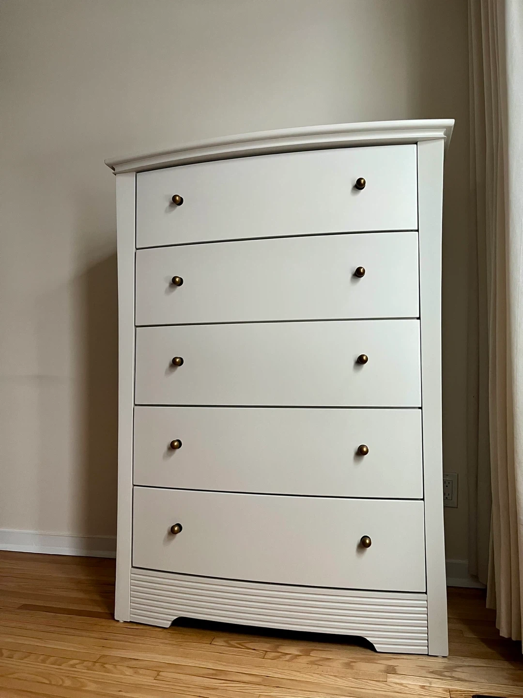 Upgrade your bedroom with this beautifully refinished bedroom furniture set. Each piece has been sanded, primed, and painted in a clean, modern off-white / cream finish and sealed for long-lasting durability. Cohesive style, timeless look, and unique shapes.