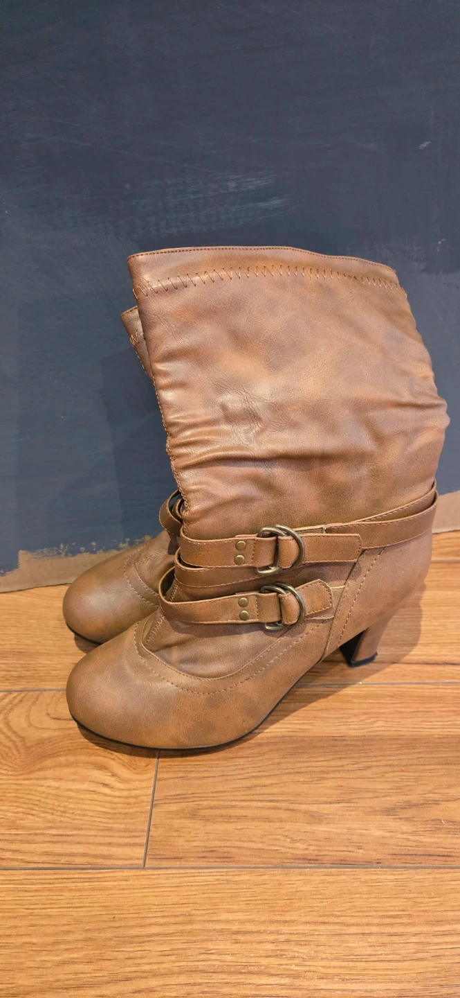 Brown slouch boots with a faux leather finish. These boots feature decorative buckles across the shaft. They have a stacked heel and a rounded toe. Perfect for a casual fall or winter look!