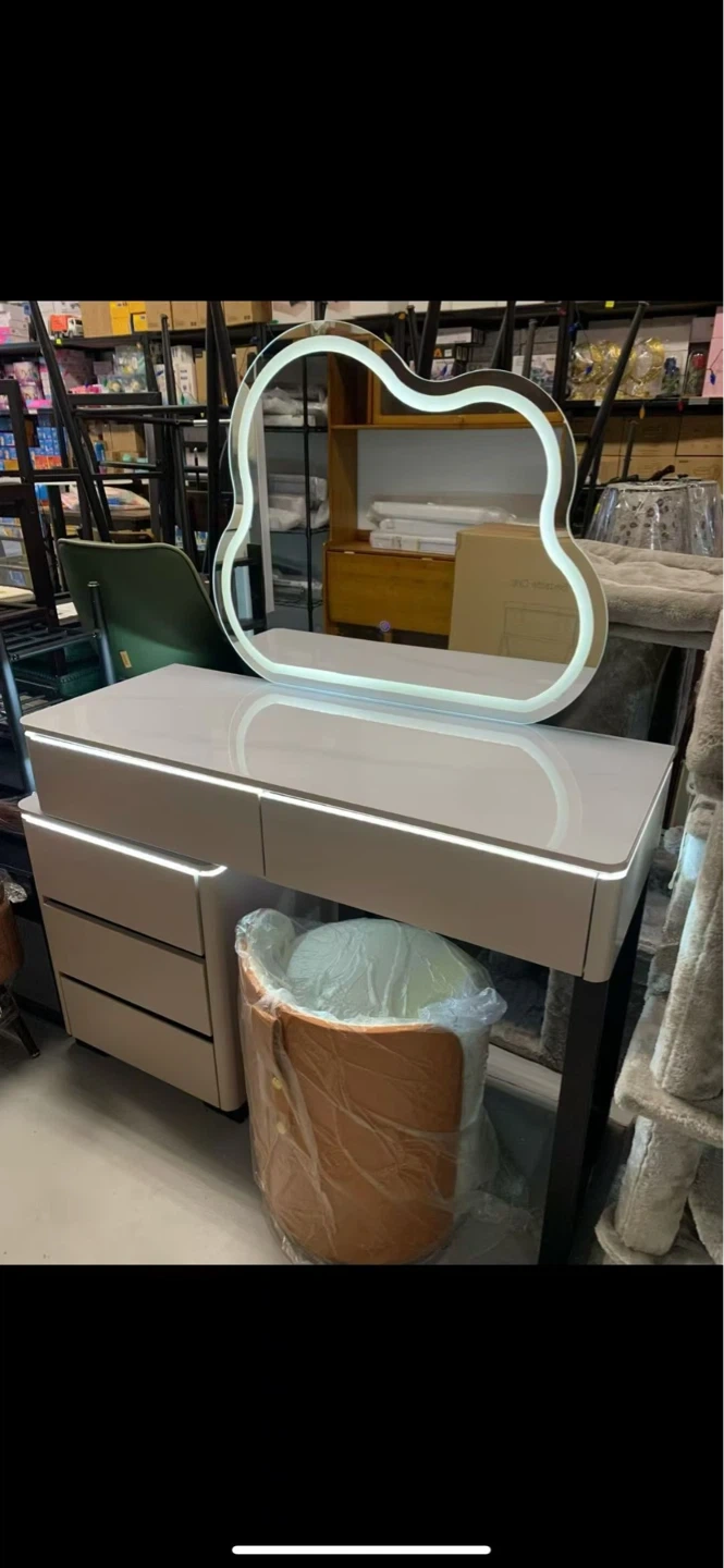 White modern vanity set with a unique cloud-shaped LED mirror and matching stool. It features three drawers for storage. Great for organizing makeup and accessories!