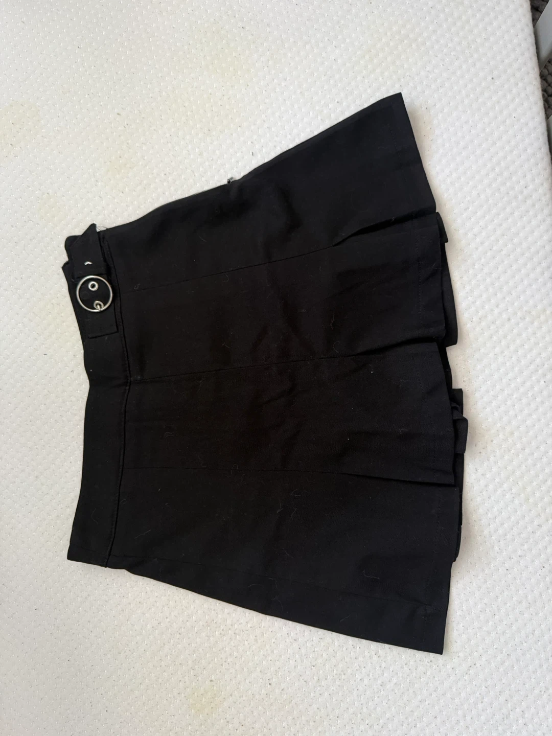 This black pleated mini skirt is from Bershka. It features a side zipper and a decorative buckle at the waist. Made in Turkey. Size US 26 / MEX 26 / EUR S.