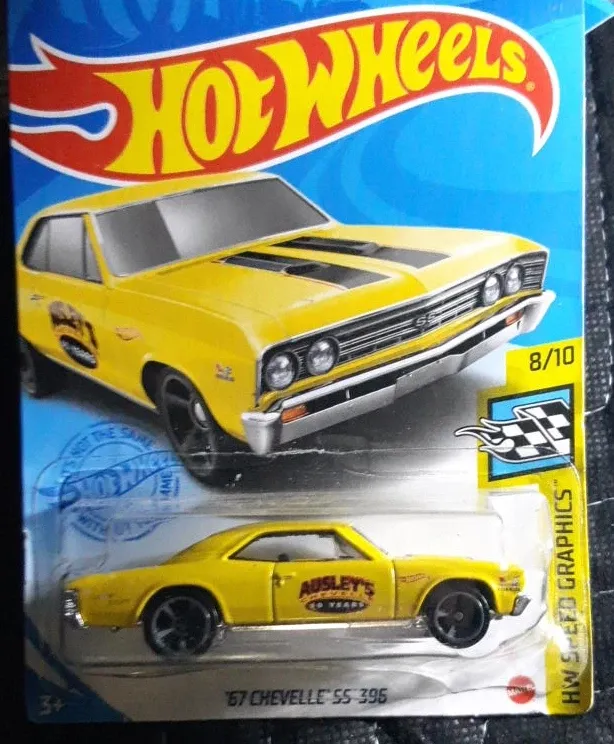 This is a Hot Wheels die-cast model of a '67 Chevelle SS 395. It's part of the HW Speed Graphics series, numbered 8/10. The car is yellow with 'Ausley's Chevelle' graphics. Suitable for ages 3+.