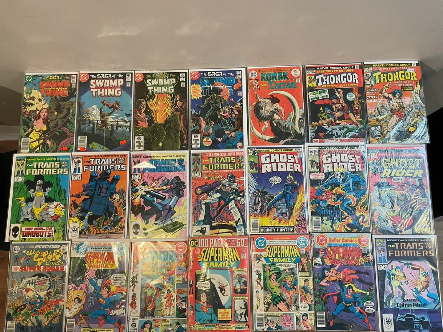 This is a collection of assorted DC and Marvel Bronze Age comic books, featuring titles like Justice League of America, Action Comics, Batman, Superman, Thor, and The Transformers. These comics span various issues and eras. They're perfect for any comic book enthusiast or collector looking to add to their stash. 1.75$ each . Warlord , arak and kazar lots are 1$ each . Sold as a log