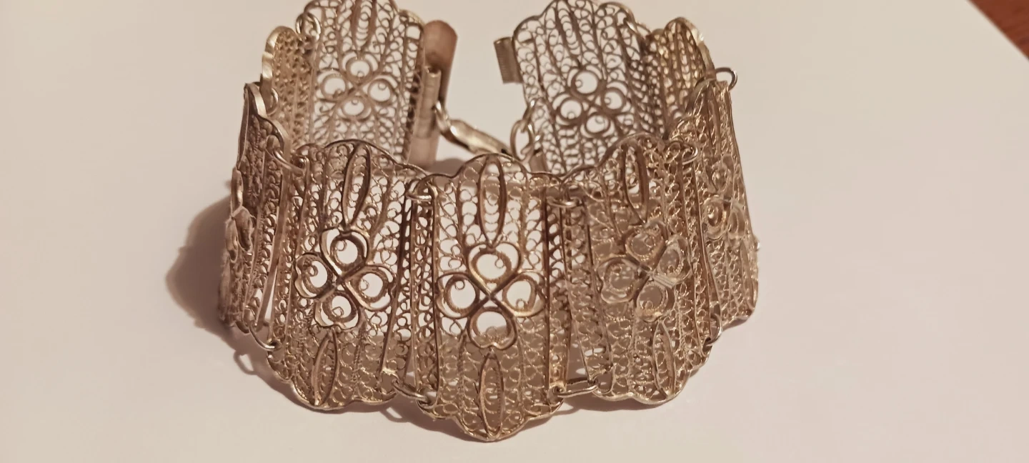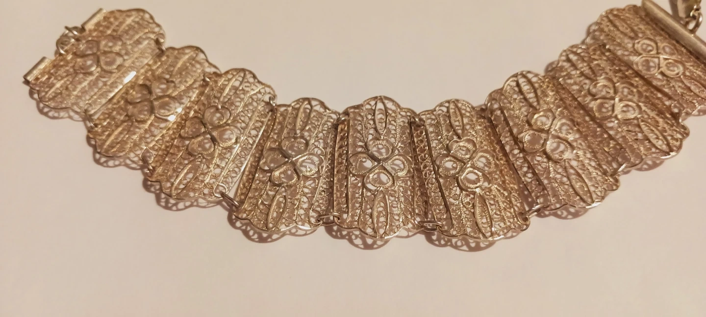 Sterling Silver 925 stamped beautiful wide bracelet with intricate filigree work. Each section features a floral design with delicate swirling patterns. It's designed with a secure clasp for easy wear. This piece adds an elegant touch to any outfit!!! 7.5" long. Excellent condition. ALL MY PRICES ARE NEGOTIABLE !!