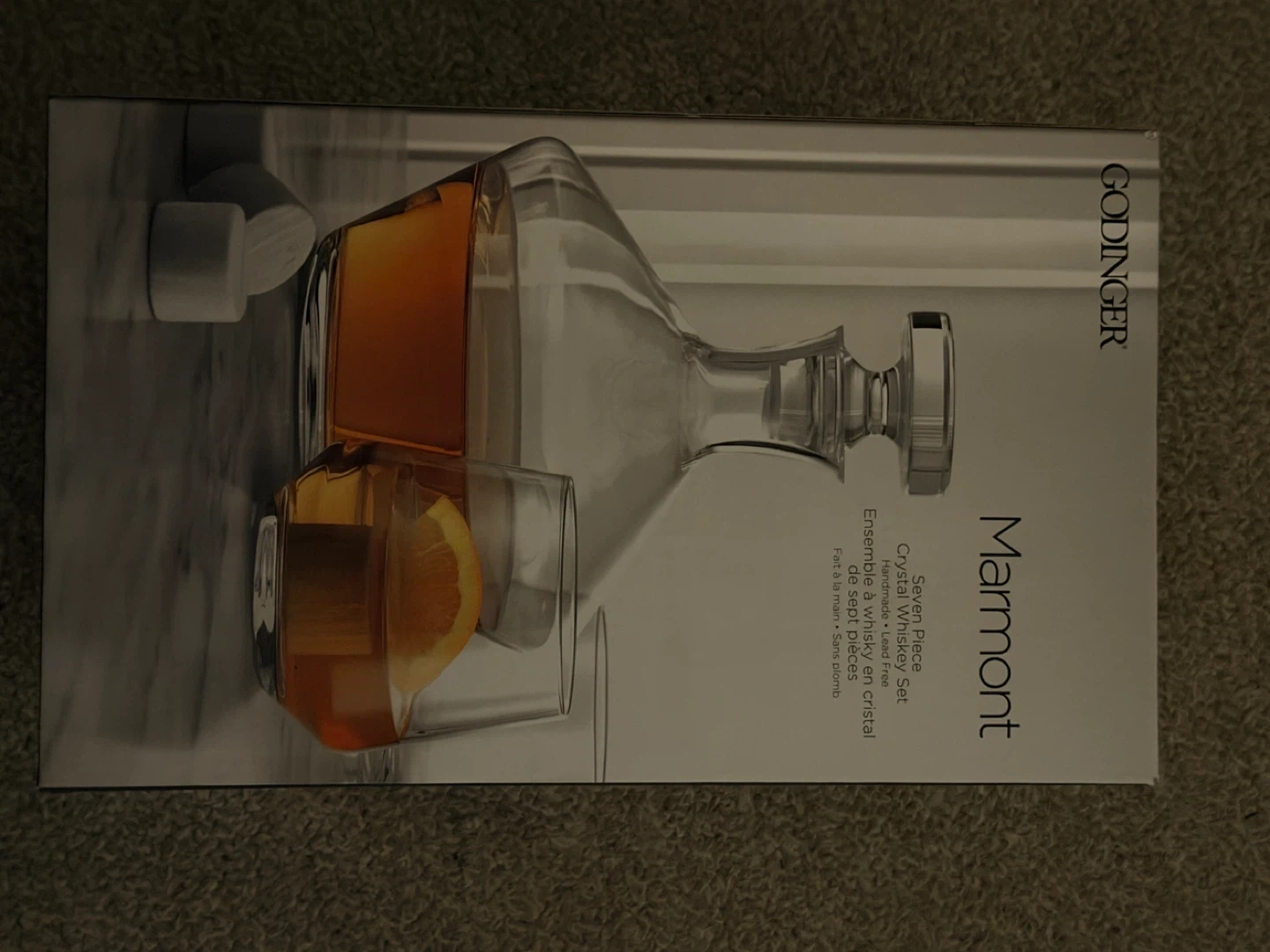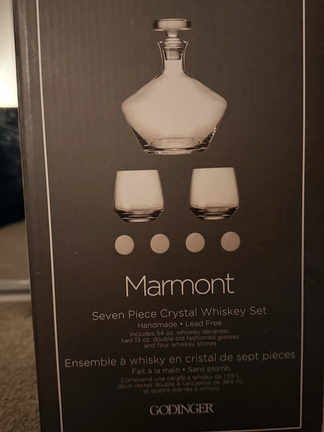 This is a Godinger Marmont Seven Piece Crystal Whiskey Set. It's handmade and lead-free. Includes a 54 oz. whiskey decanter, two double old-fashioned glasses, and four whiskey stones.