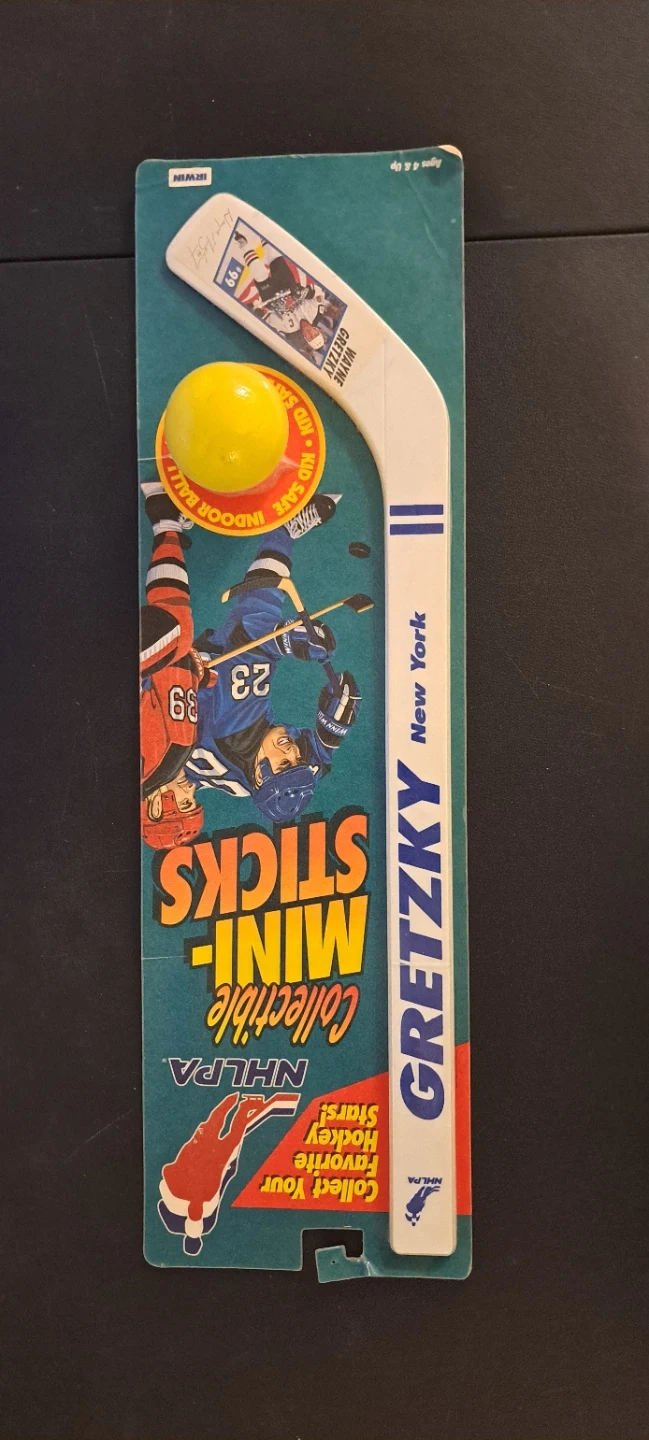Vintage Wayne Gretzky New York Mini Sticks collectible. It includes a yellow indoor ball that's kid-safe. Perfect for any hockey fan's collection!