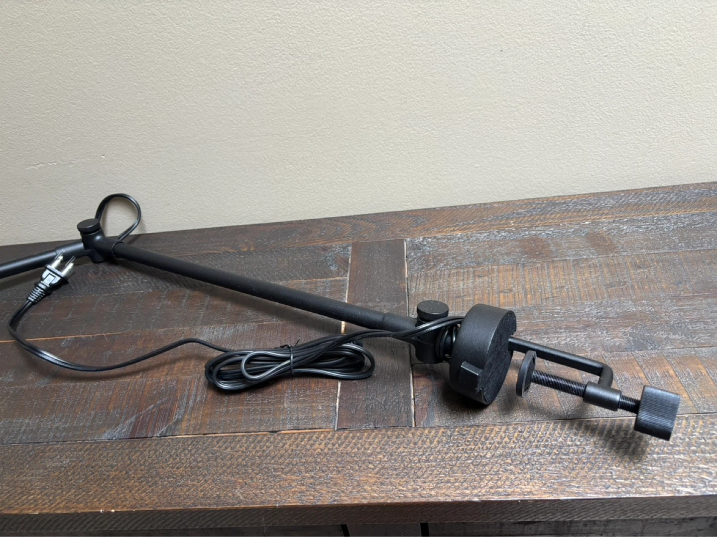 Black adjustable desk lamp with a clamp base. This lamp uses a single bulb and has an articulated arm for positioning.