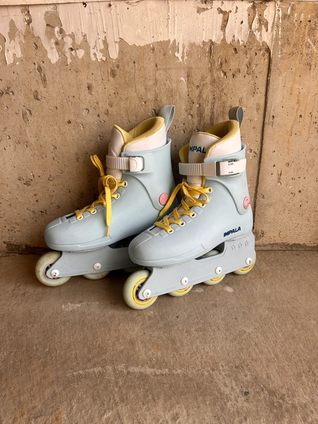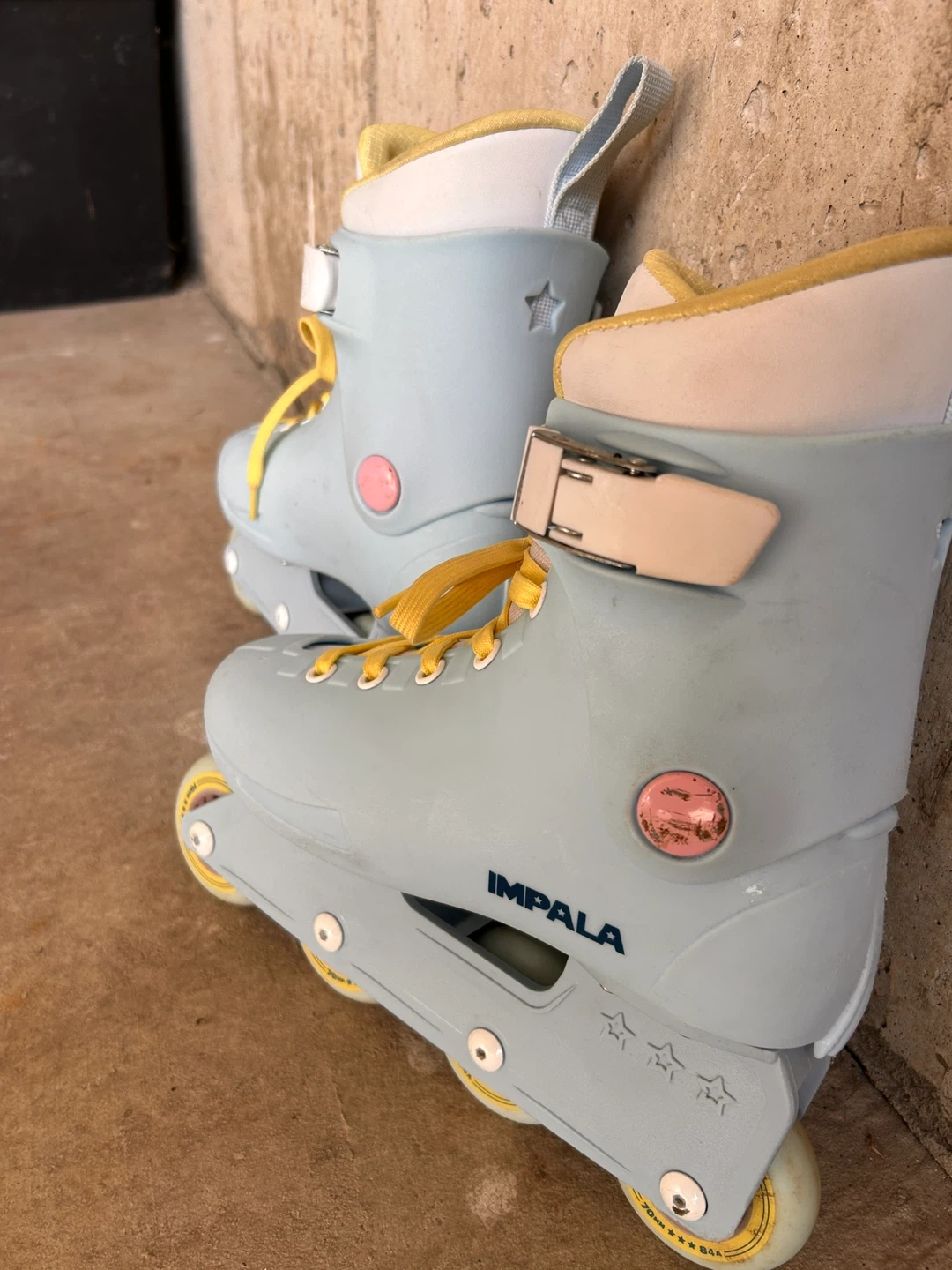 Impala inline skates in a light blue colour. Yellow laces and accents. Size 6 US Women's. Perfect for cruising around town! Snug fit.