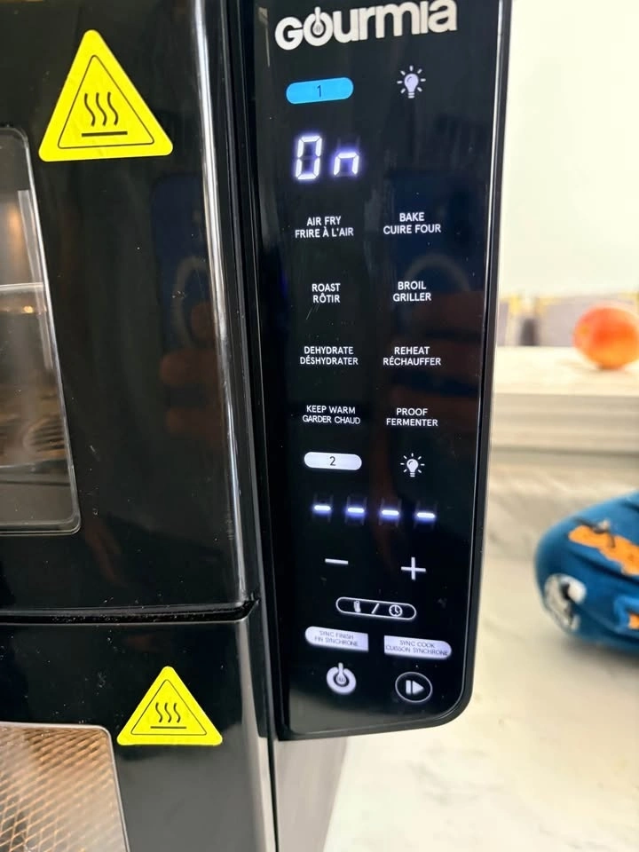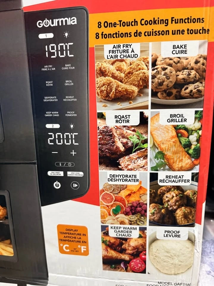 Spacious Gourmia dual basket air fryer with 10.4 L capacity, great for cooking more food in less space. Comes with 8 one-touch functions: air fry, bake, roast, broil, dehydrate, reheat, keep warm, and proof. Features 4-layer cooking and Sync Finish so different foods can be ready together. Also has Sync Cook to match settings easily. Model GAF1180. Great condition. Pickup in the Huron area, Kitchener, opposite Huron Heights Secondary School.
