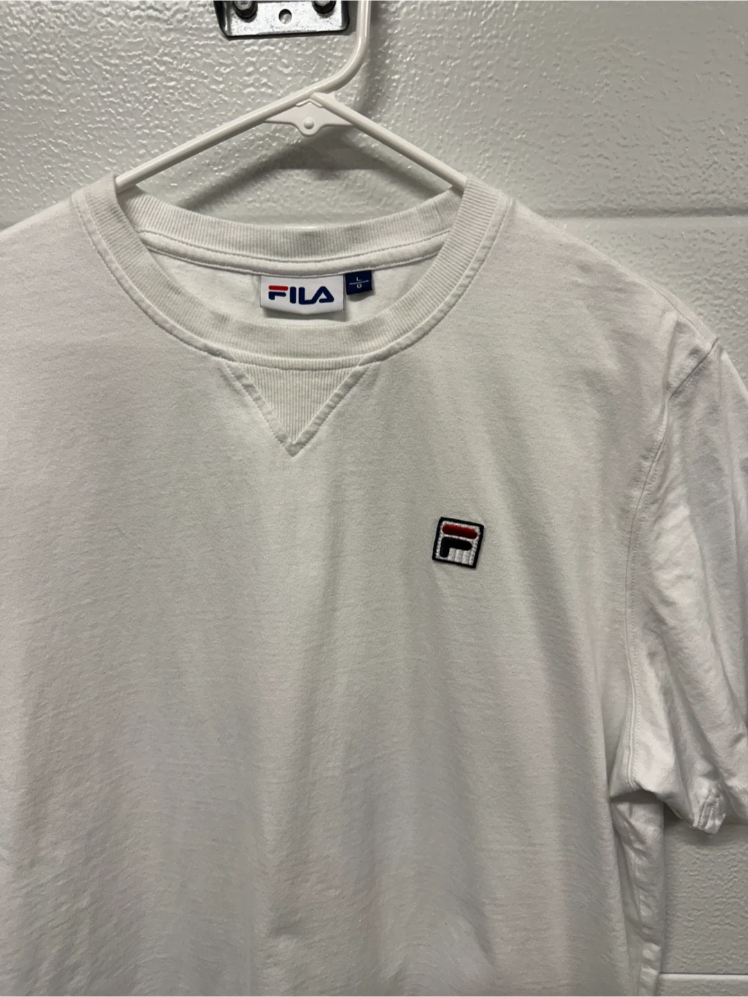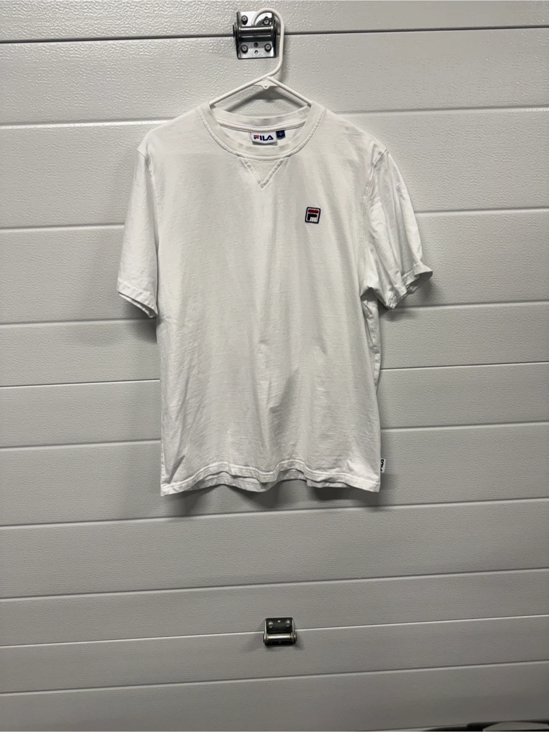 White Fila t-shirt with small Fila logo on the chest. Made with 100% cotton for a comfortable feel. Size is large. A classic casual staple!