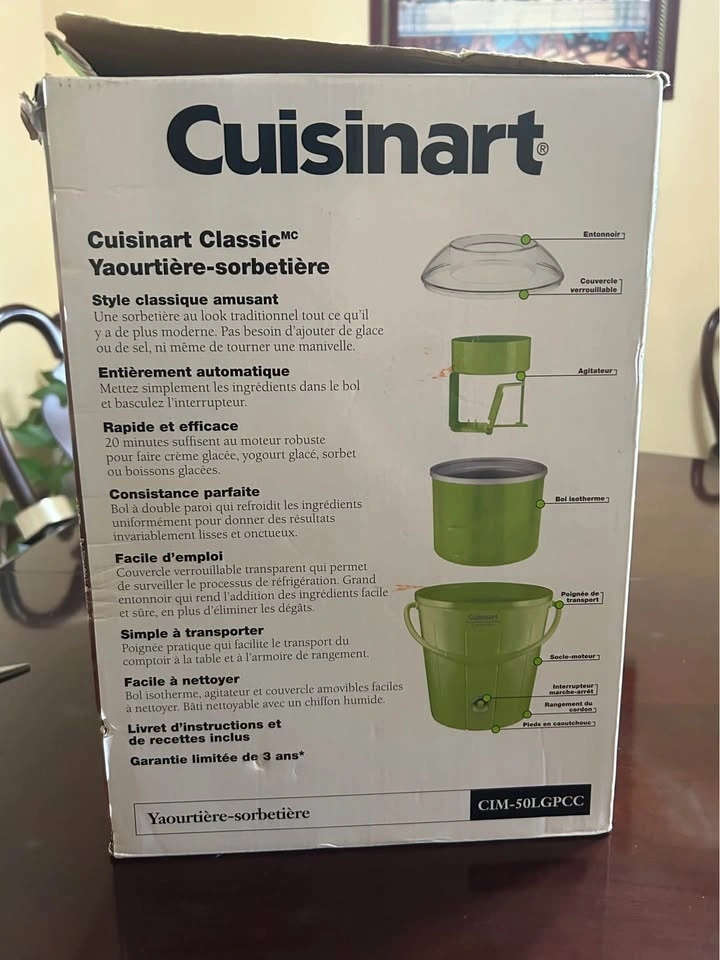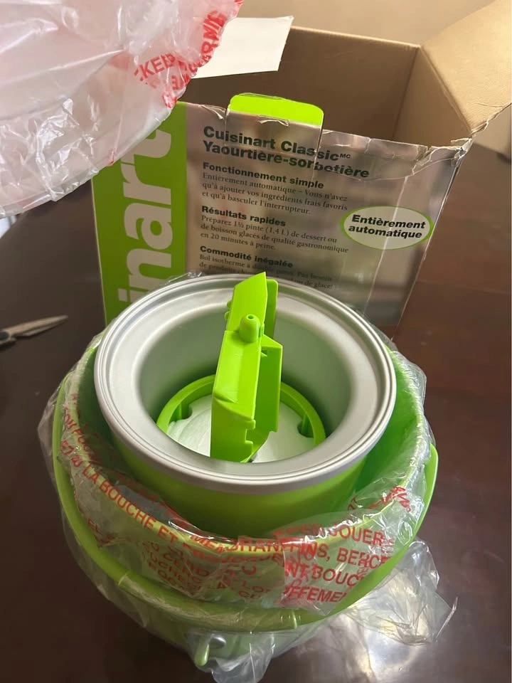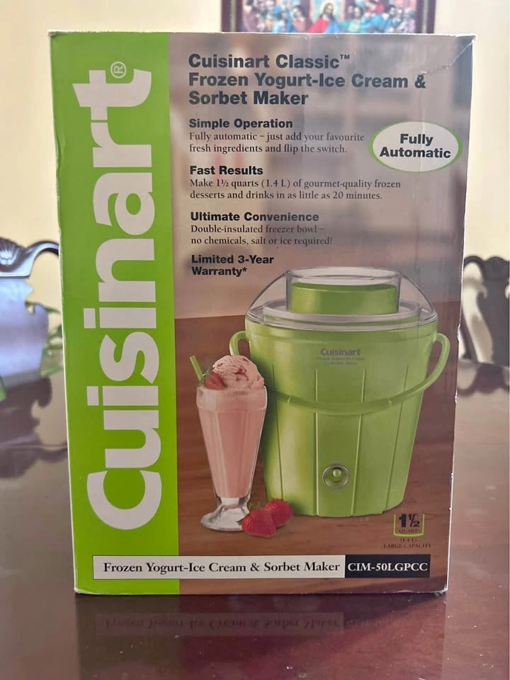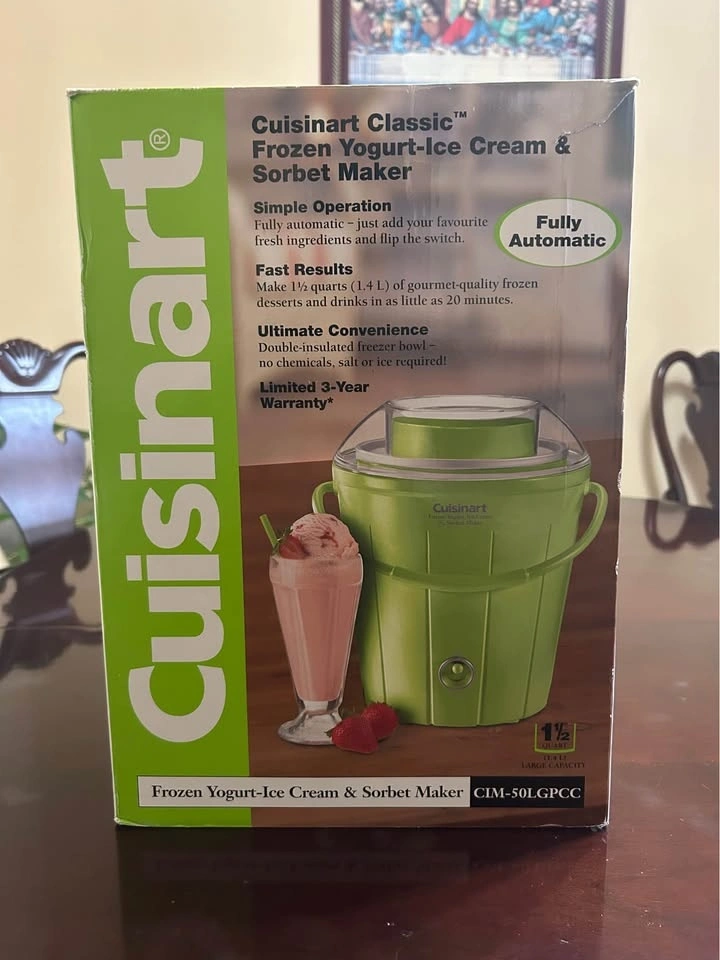 Brand new Cuisinart Classic Frozen Yogurt, Ice Cream & Sorbet Maker. Never used. The box is slightly damaged, but the machine itself is brand new and untouched. Fully automatic, fast results, and large 1.5-quart capacity. Great for homemade ice cream, sorbet, or frozen yogurt.