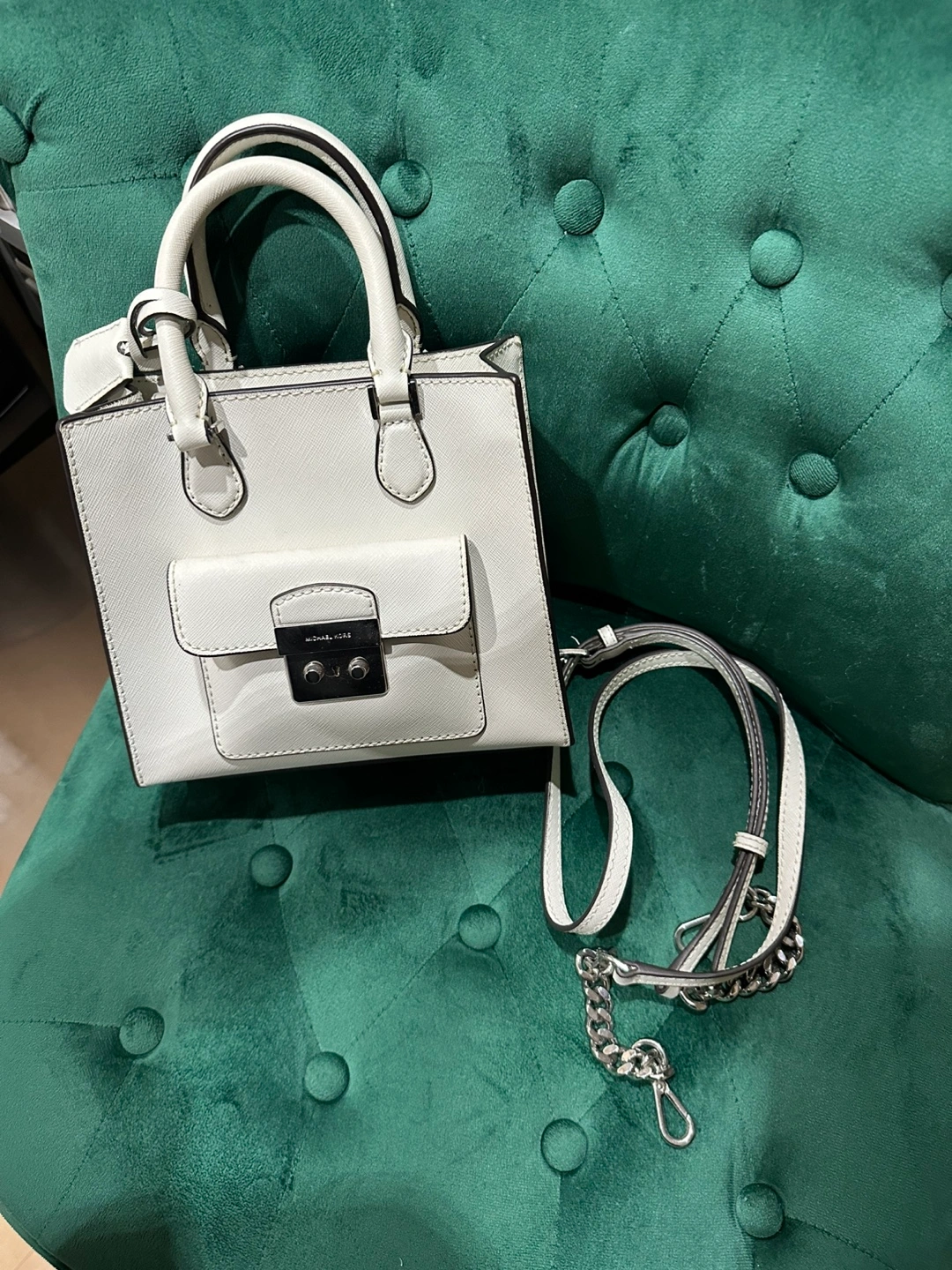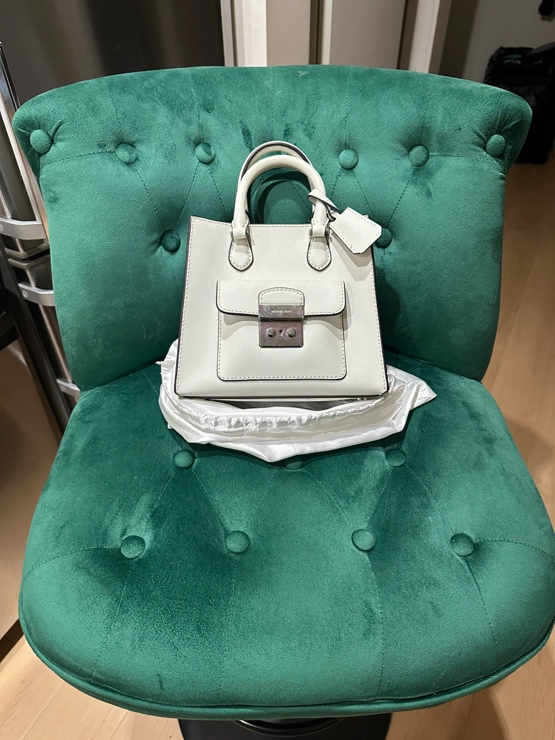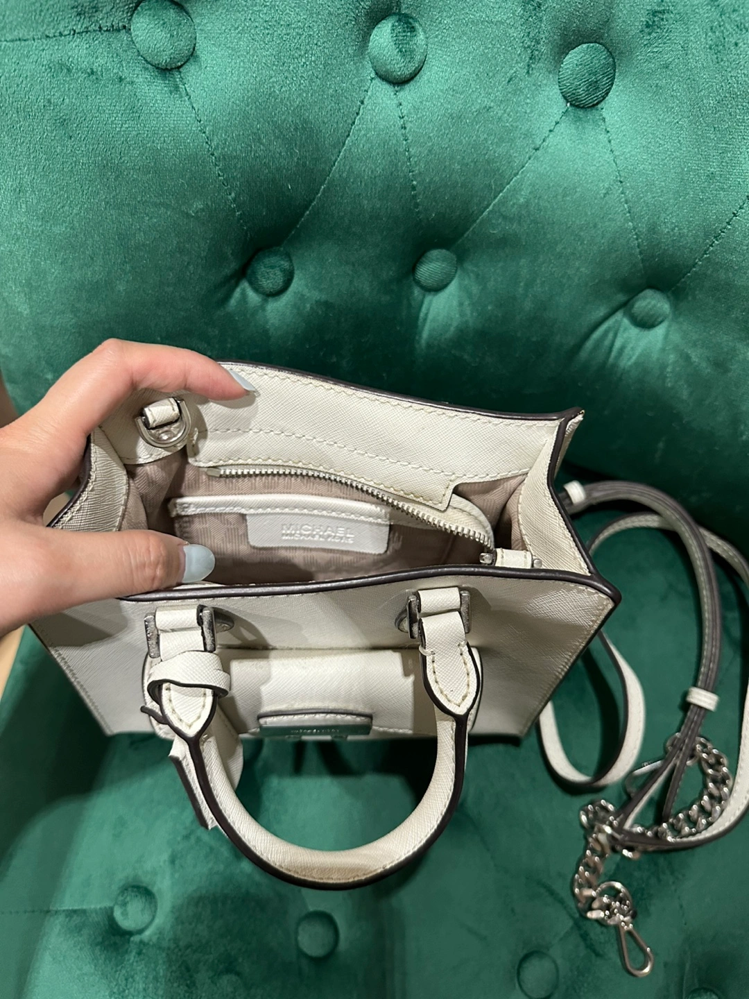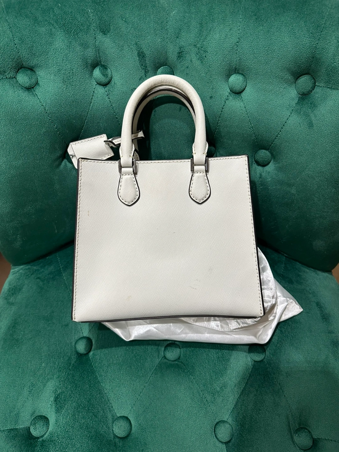 Features a top handle and inside pockets. Exterior pocket in the front with clasp push lock closure, fabric lining. Removable/adjustable longer strap for shoulder or crossbody wear. Flat bottom with 4 protection feet . This handbag Does NOT include the original dust bag but one for protection during storage. Minor mark/stain on the back as shown in the photo. Small size, perfect for everyday use.