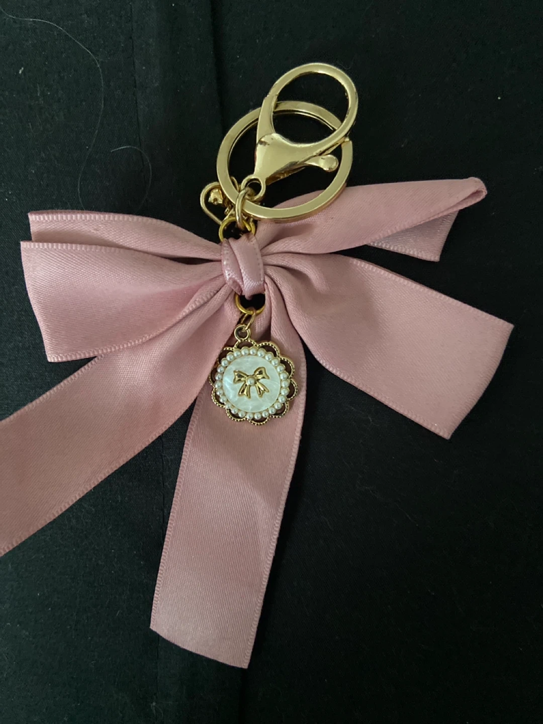 A cute pink ribbon bow keychain with a decorative charm. The charm is round with a pearl border and a gold bow design in the centre. It's attached to a gold-tone keyring and clasp. This accessory adds a touch of flair to bags or keys!
