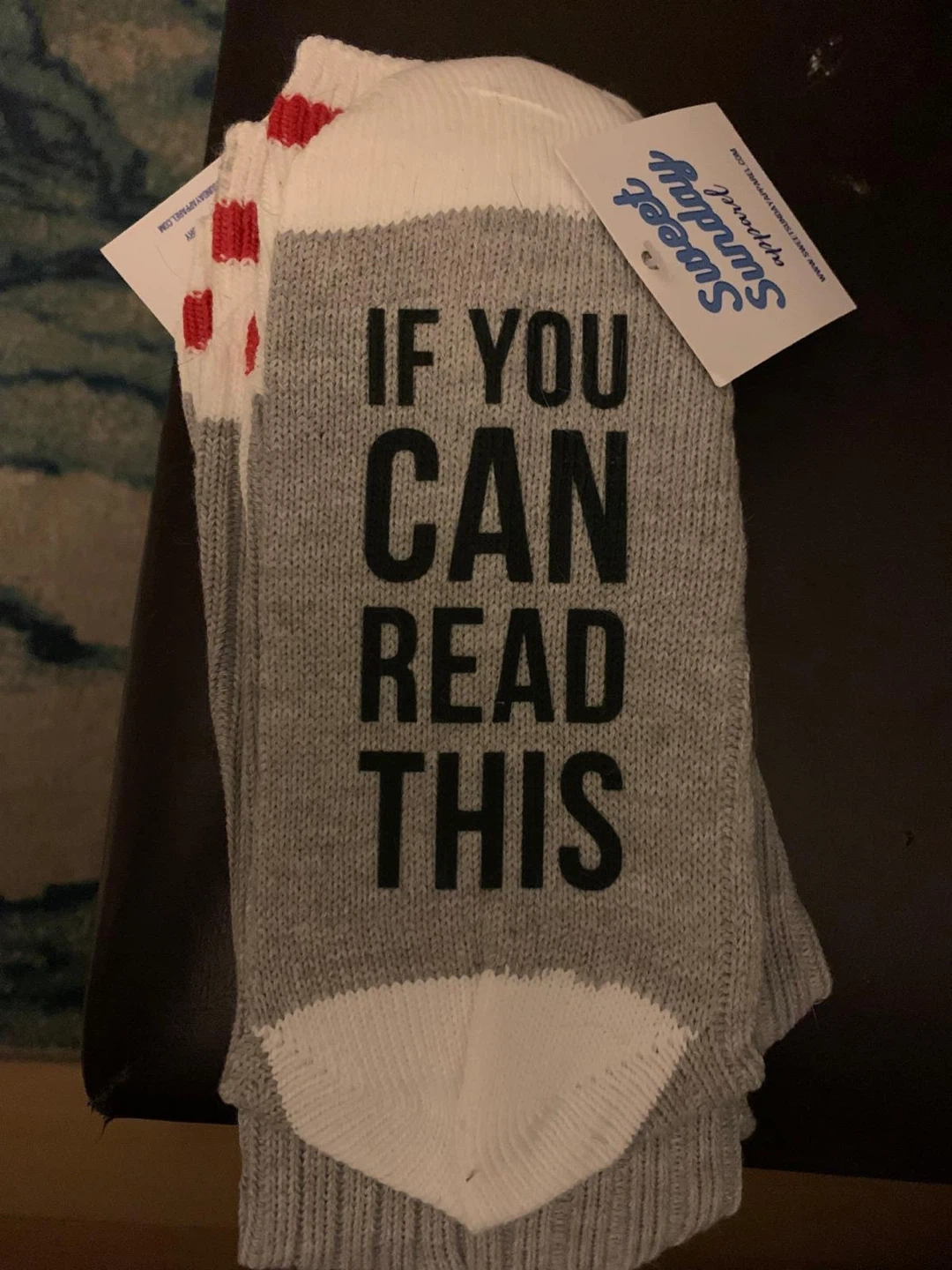 These fun socks from Sweet Sunday Apparel say "If You Can Read This Bring Me Tacos". They feature a grey base with white and red accents. Great for taco lovers!