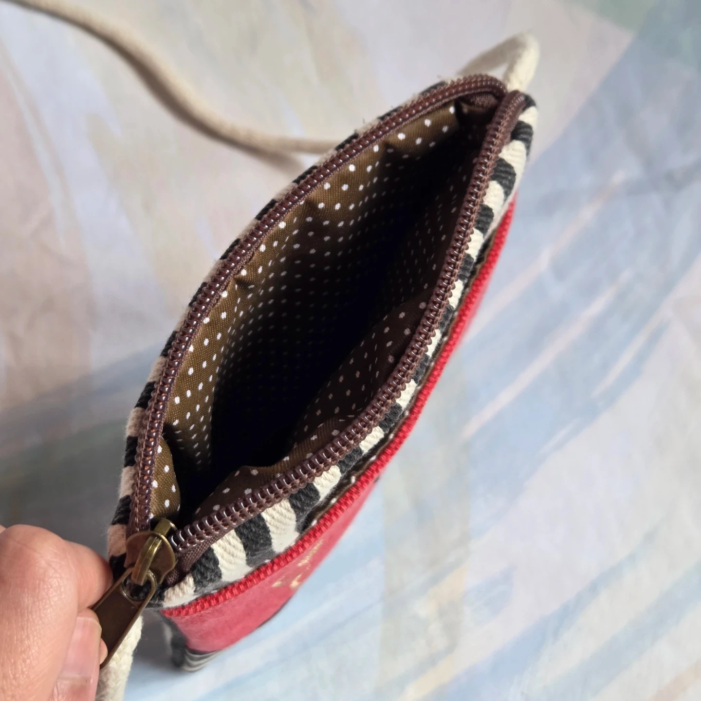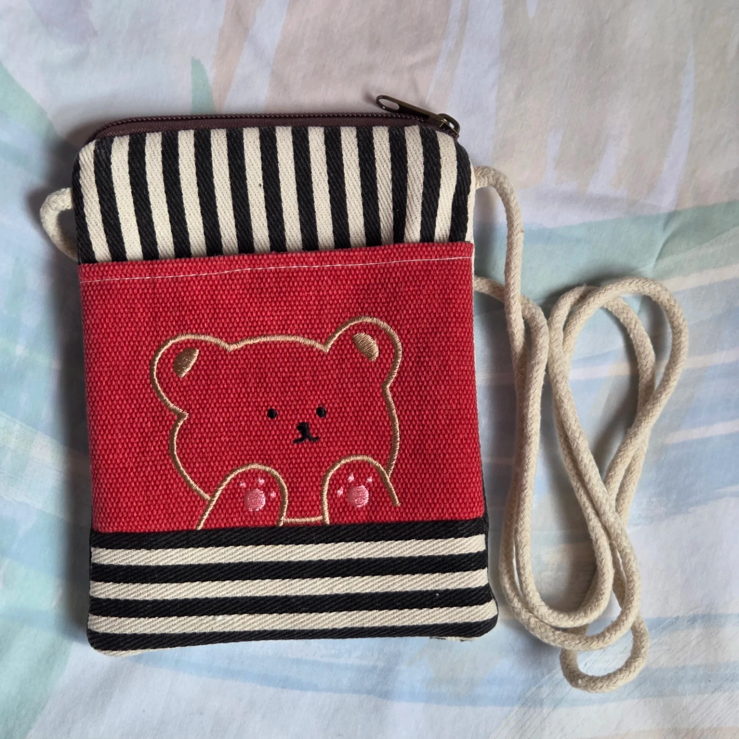Selling a cute, small crossbody bag with a bear embroidered on the front