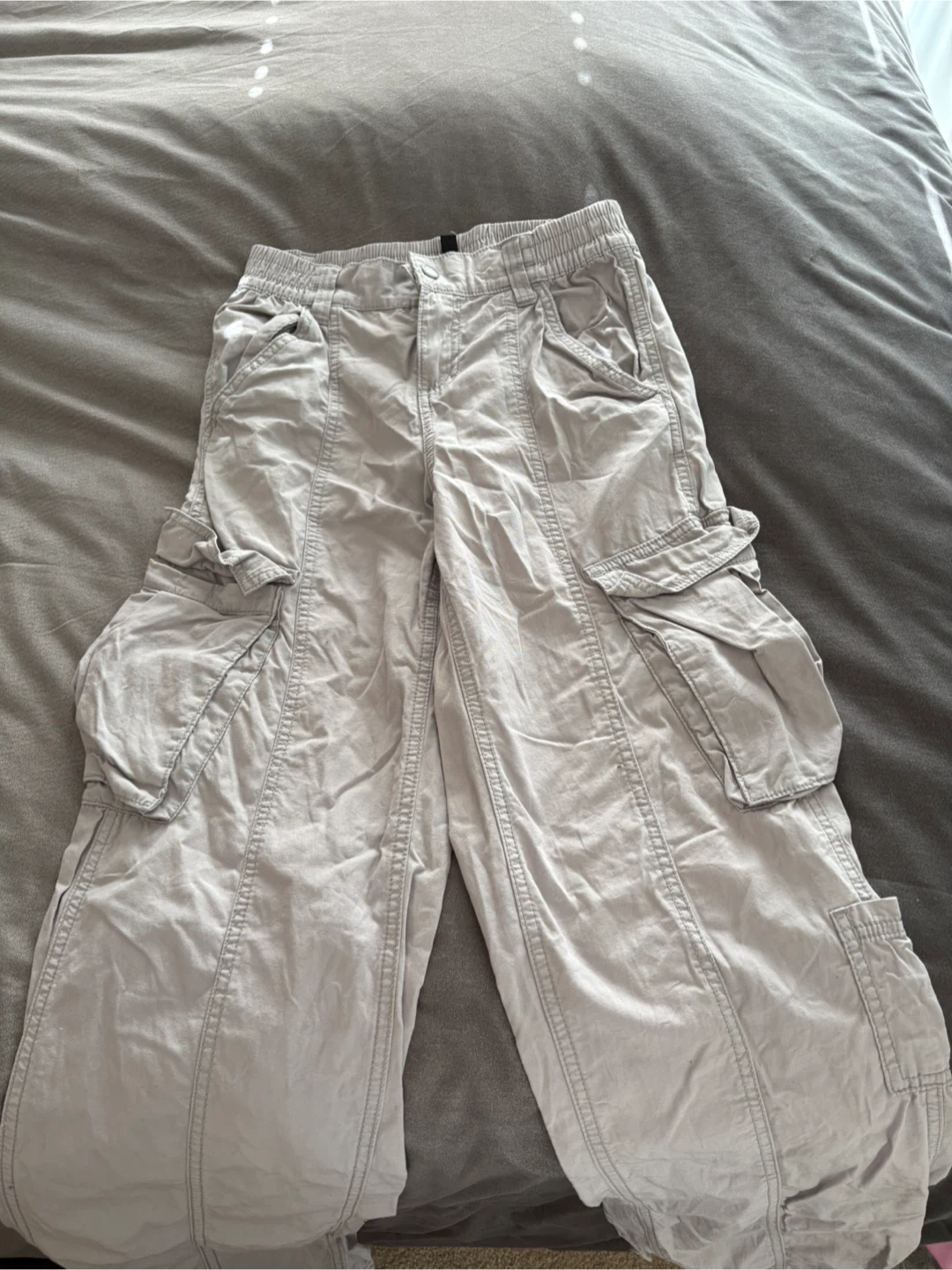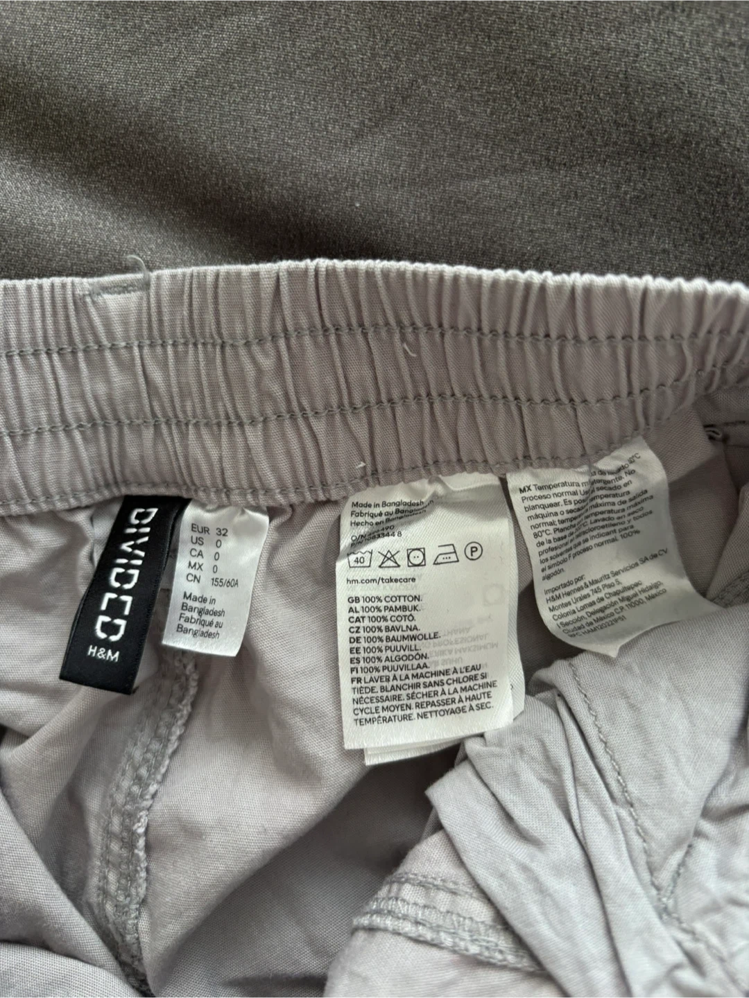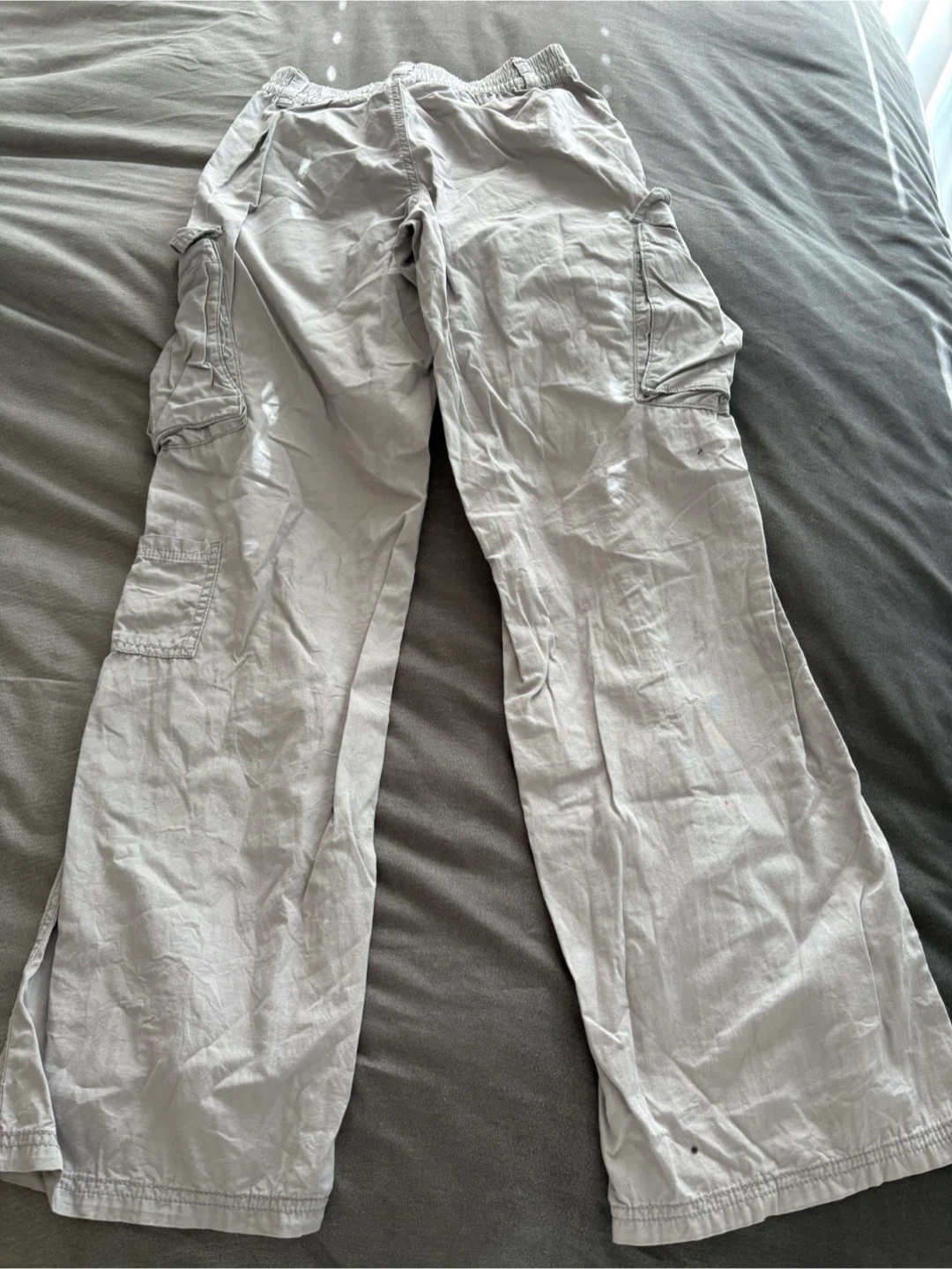 These grey cargo pants are made from 100% cotton. They feature an elastic waistband with a drawstring for a comfortable fit. Multiple pockets for convenience.
