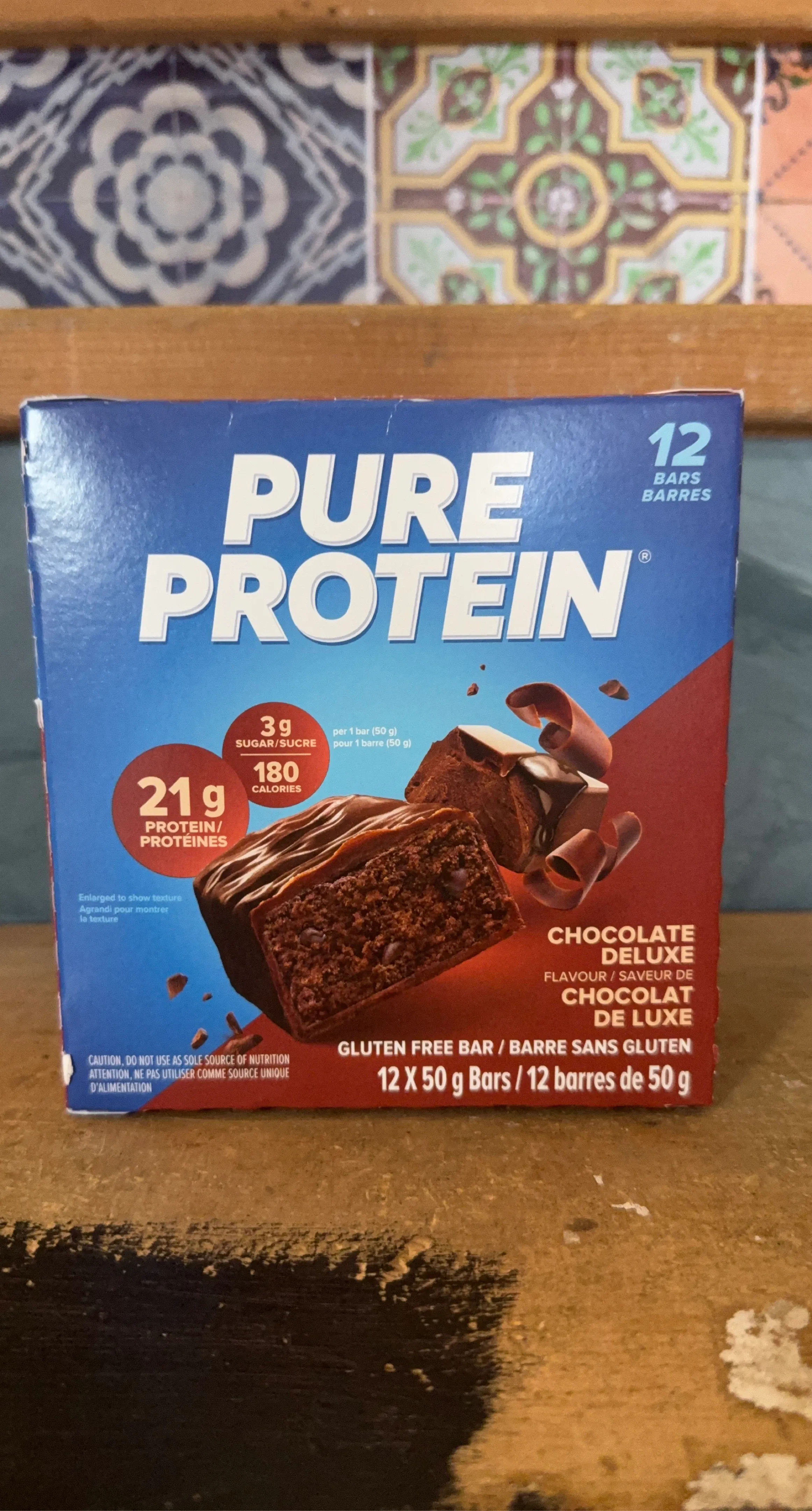 Unopened box of 12 Pure Protein Chocolate Deluxe bars. These gluten-free bars contain 21g of protein and 180 calories per bar. Best before October 27, 2026.