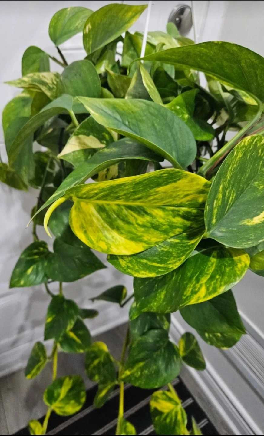 Healthy Golden Pothos plant with beautiful variegated green and yellow leaves. This vine is known for its easy care. Perfect for adding a touch of green to any indoor space!