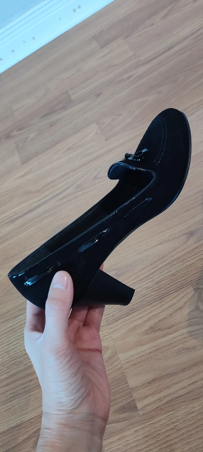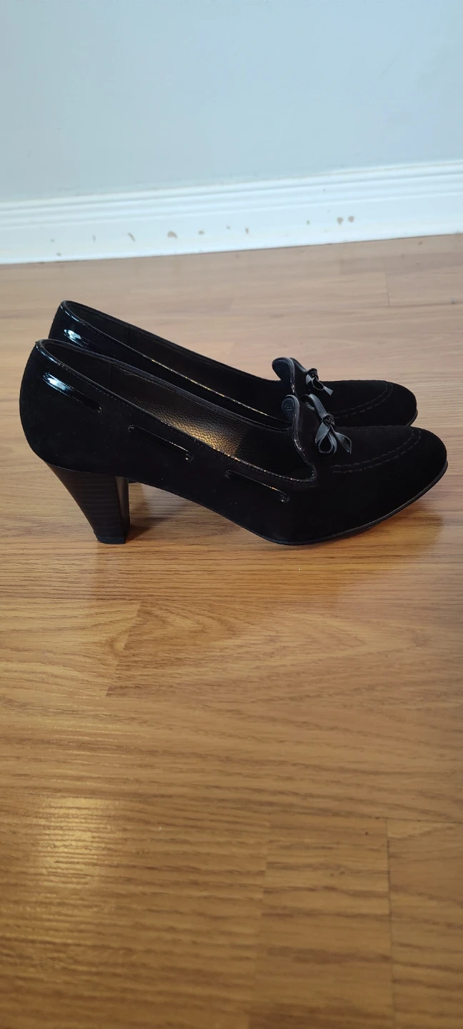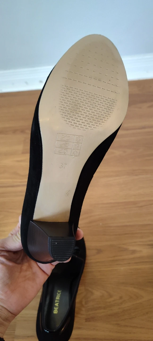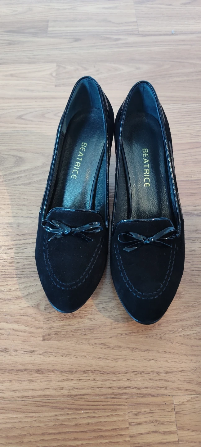 A pair of brand new Beatrice black heels. It's made of genuine leather and have a patent leather trim. These shoes have a pointed toe and a small bow detail. Size 37.