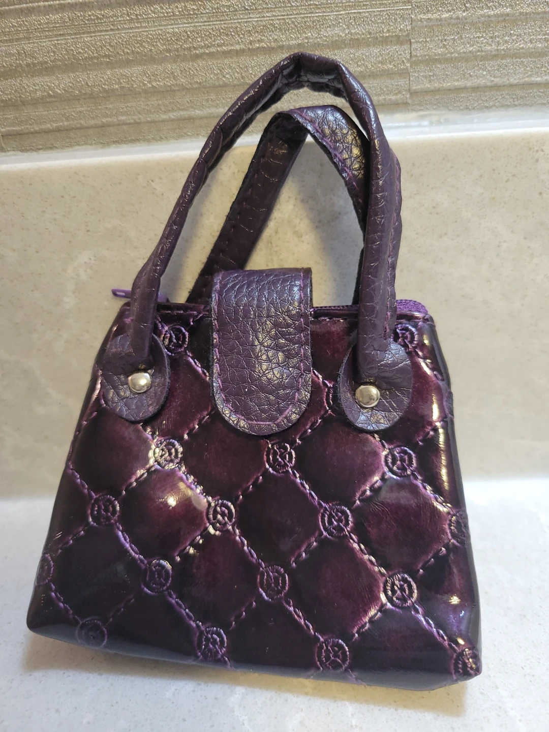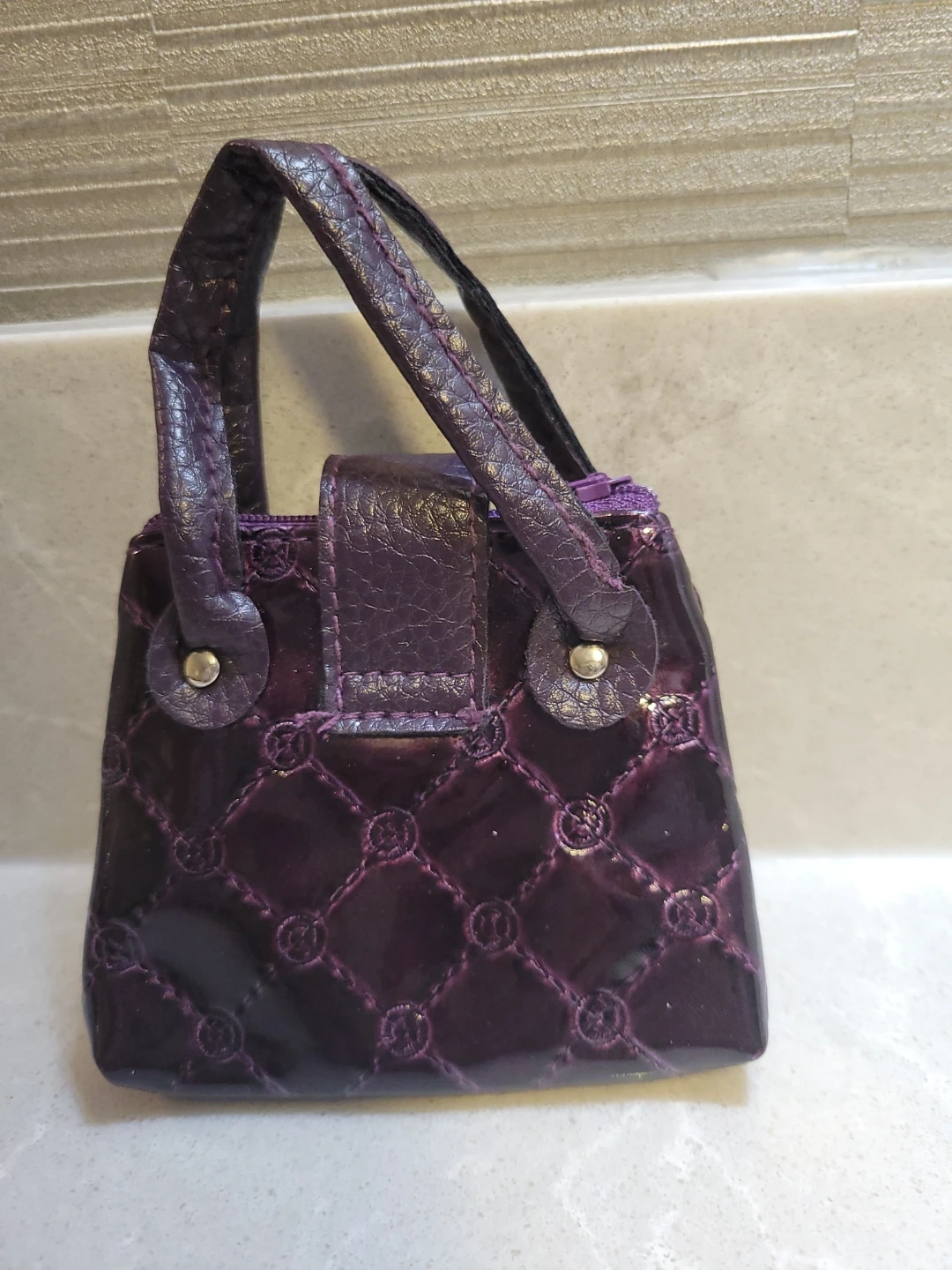 CUTE small mini purple handbag with a shiny finish and a quilted pattern.