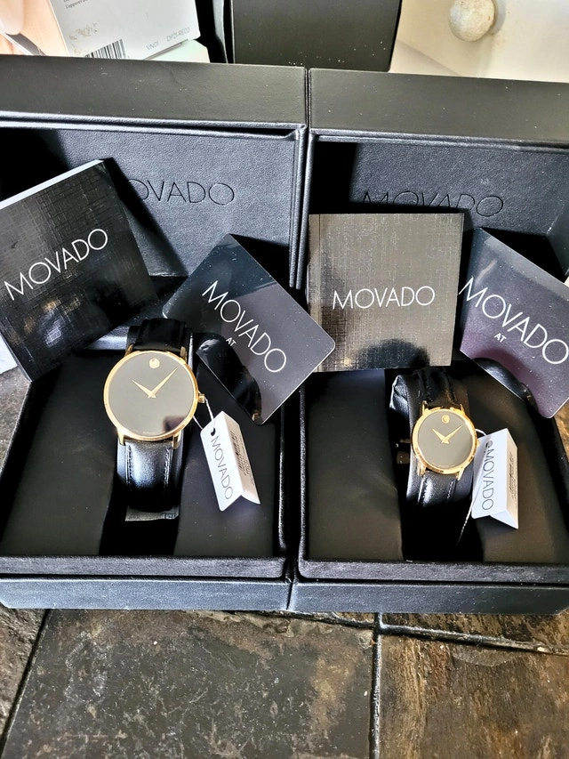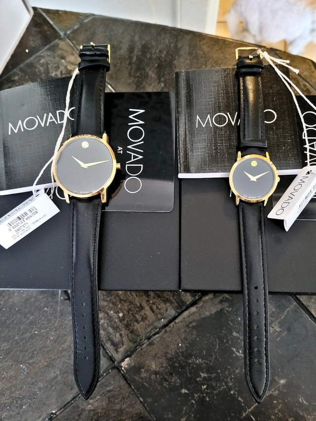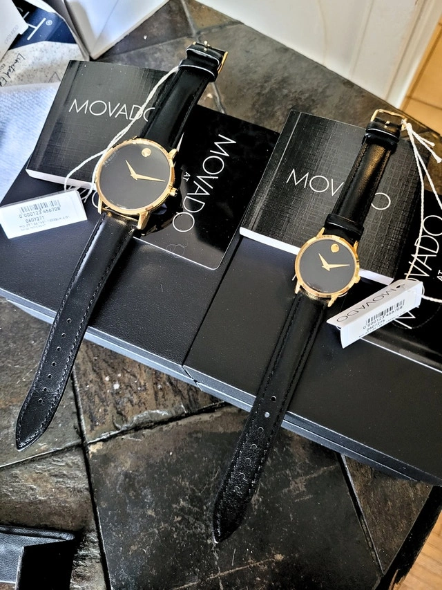 Brand new in the box with tags & booklets. Men's (40mm) and women's (28mm) Museum Classic watches. Features yellow gold PVD-finished stainless steel case, black dial with yellow gold-toned dot and hands, and black leather strap with stainless steel buckle. Sapphire crystal, Swiss movement, water resistant 3 ATM (30 M). Pick up near Sheppard & Don Mills.