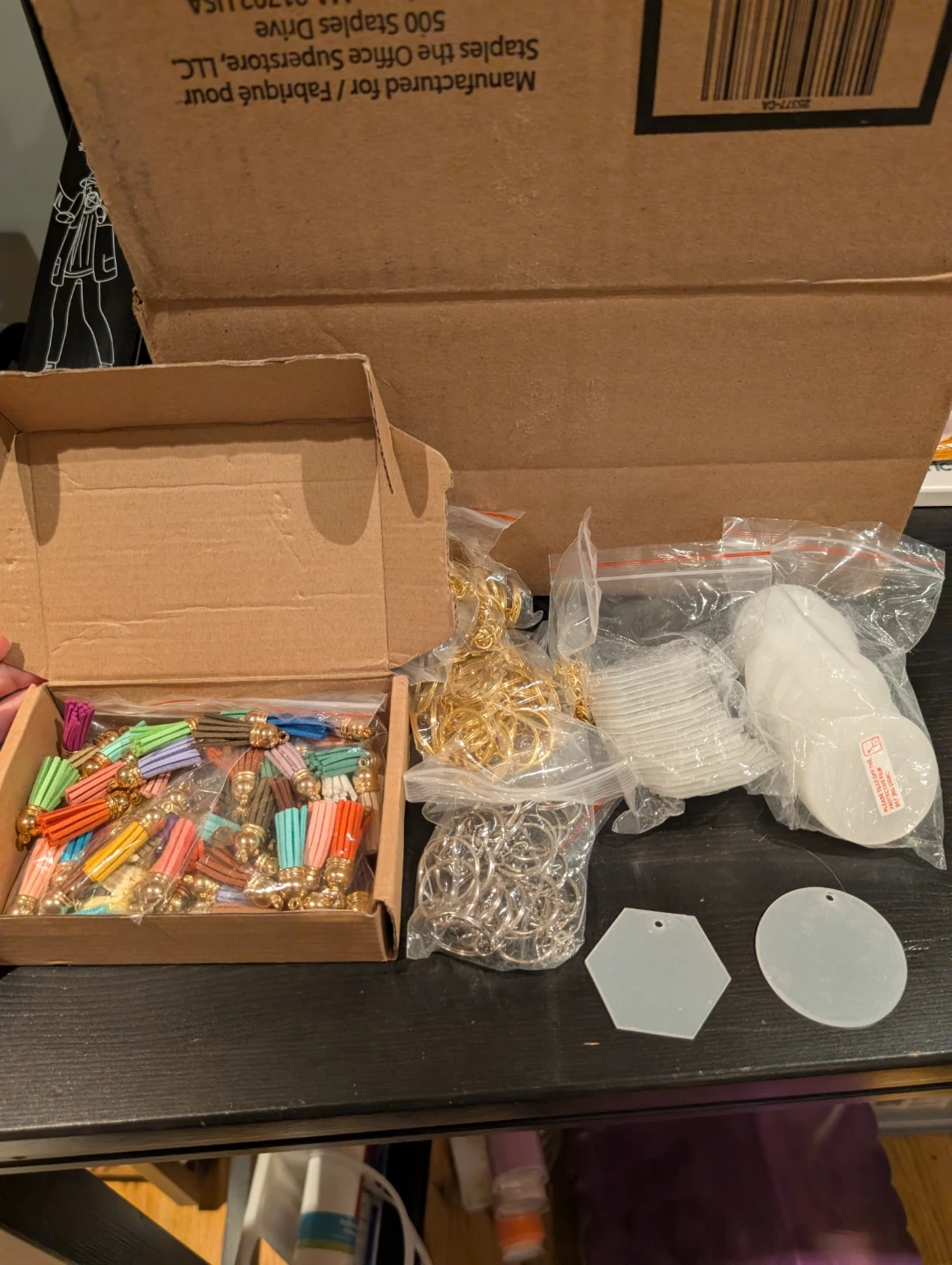This is a craft kit for making keychains. It includes multiple colourful tassels with gold caps. Also comes with various sizes of gold and silver jump rings, plus 2 inch round (28 pieces ) and 2 inch hexagonal (22)acrylic blanks. It's great for DIY projects!