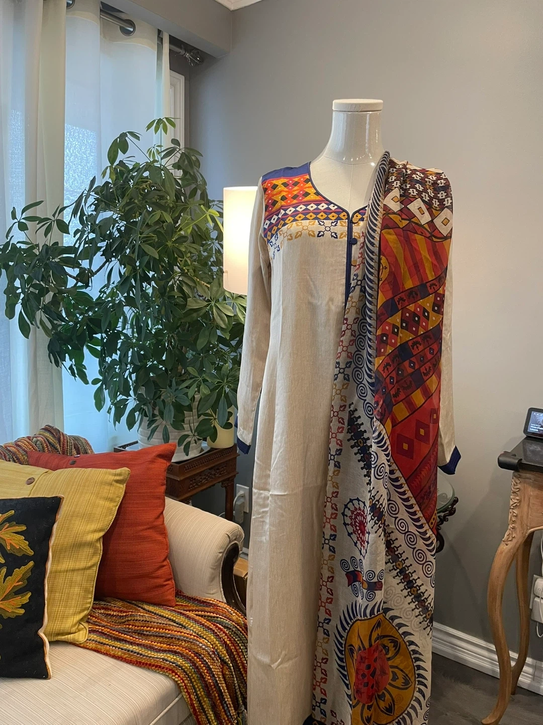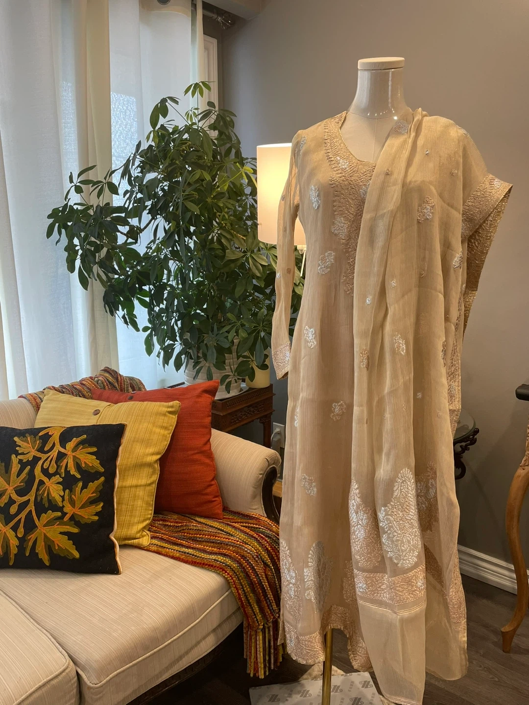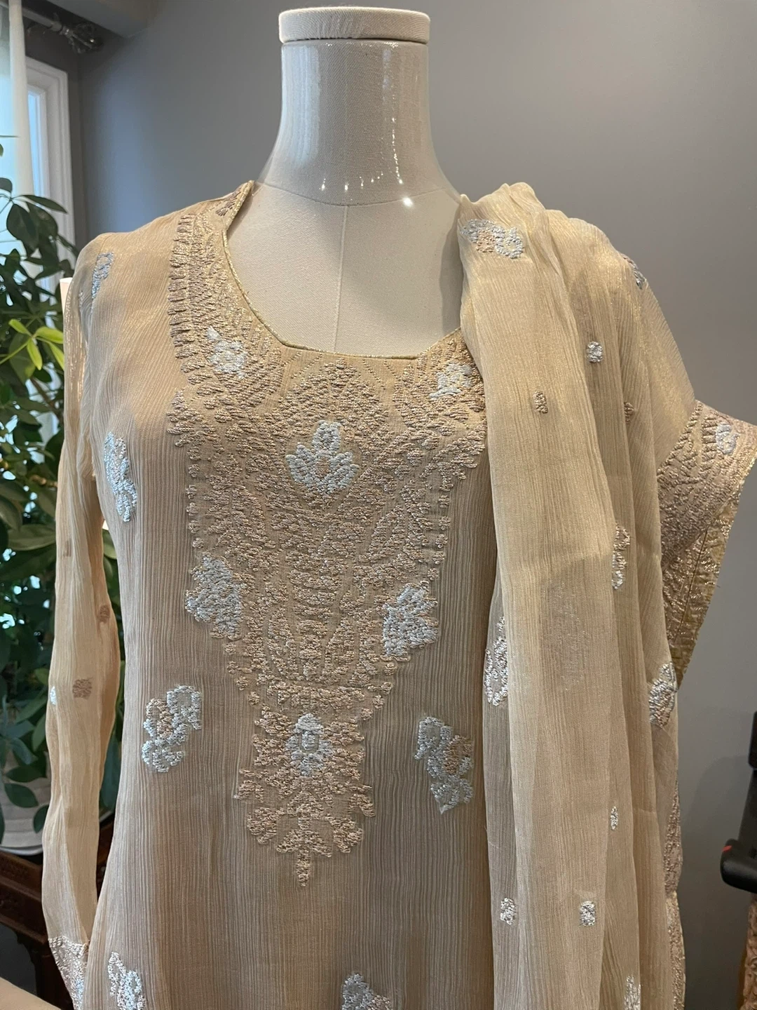 Beautifully designed silk kameez set with intricate embroidery and embellishments. Comes with a coordinating dupatta. Available in a delicate peach and a classic cream colour.