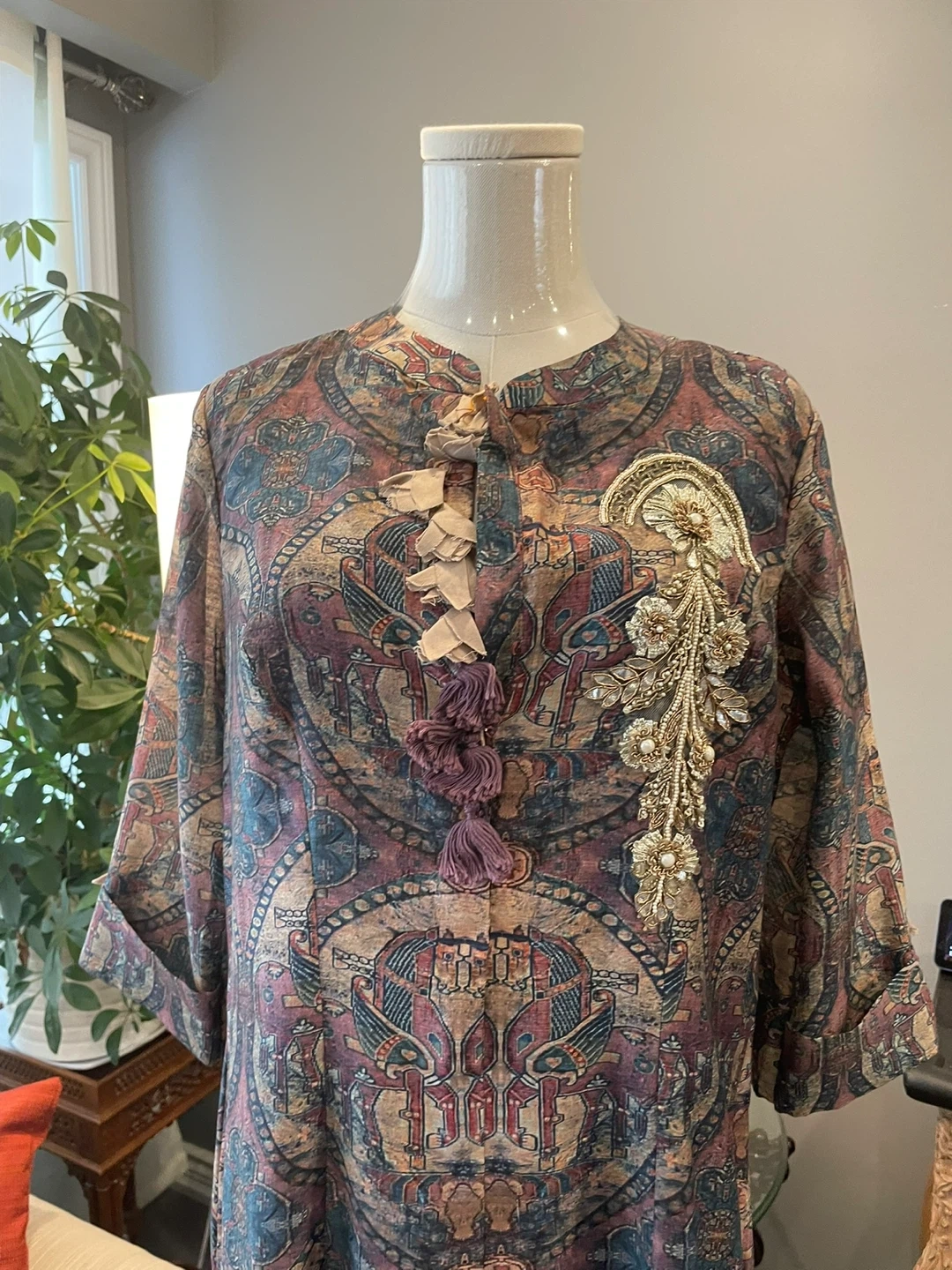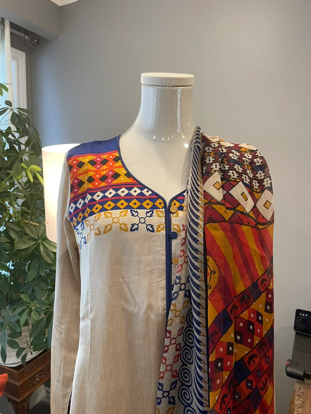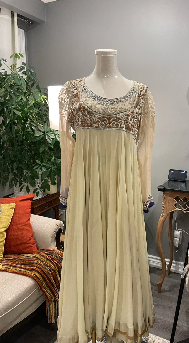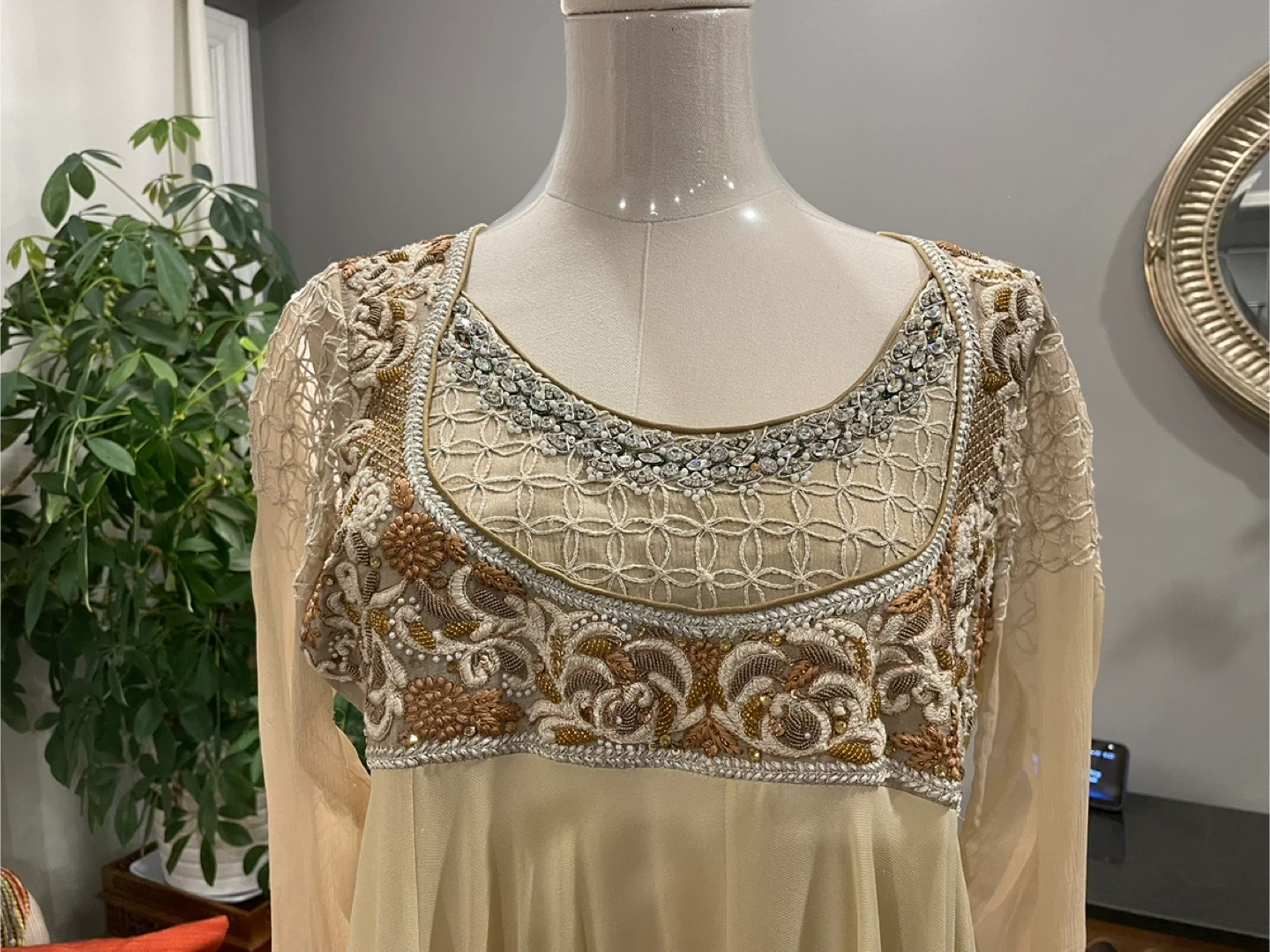 Beautifully designed silk kameez set with intricate embroidery and embellishments. Comes with a coordinating dupatta. Available in a delicate peach and a classic cream colour.